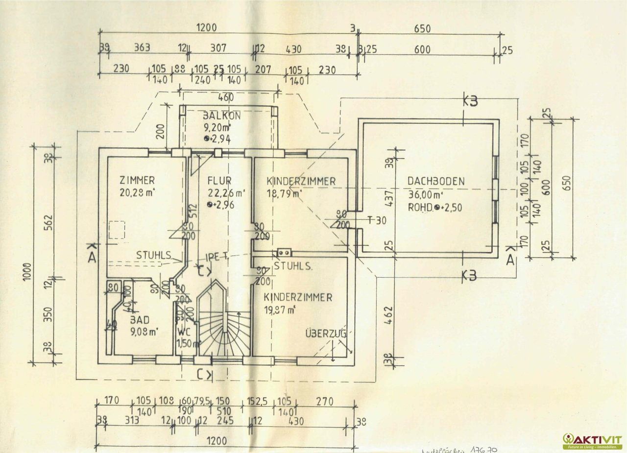 Die Wohnfläche beträgt ca. 177 m² und liegt im Erdgeschoss und Dachgeschoss. Im Erdgeschoss gelangt man über einen Windfang in einen zentralen Gang, der das Badezimmer mit WC, den Treppenabgang in den Keller sowie das Esszimmer erschließt. Vom Esszimmer aus sind das Wohnzimmer, die Küche mit angrenzender Speis sowie der direkte Zugang in den Garten erreichbar. Im Dachgeschoss befindet sich ein zentraler Flur, von dem drei Schlafzimmer, ein Badezimmer, ein separates WC sowie ein Westbalkon zugänglich sind. Eines der Schlafzimmer bietet zudem einen Zugang zum Dachboden des Garagenhauses.
