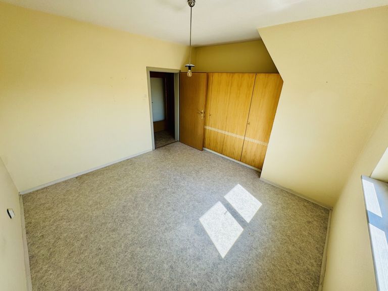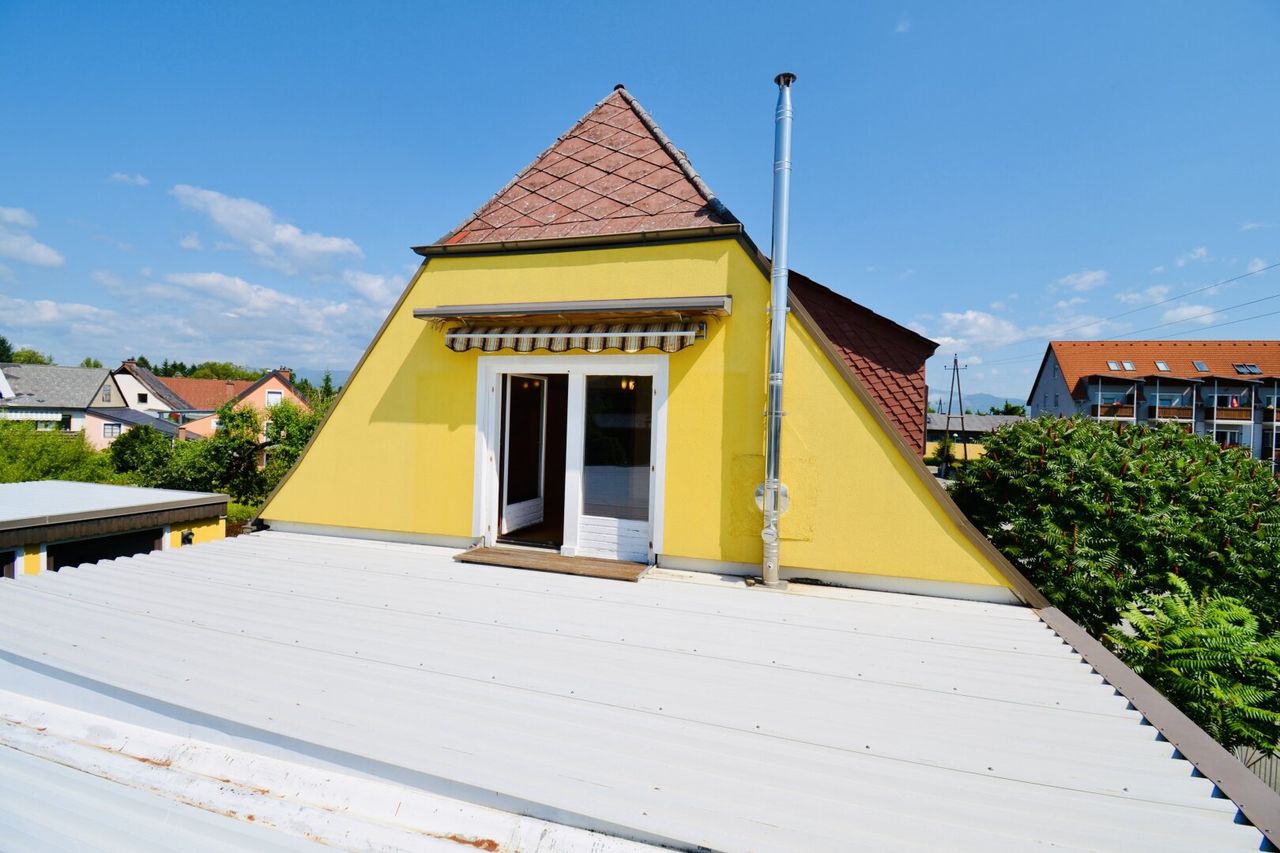 Über das zentrale Stiegenhaus gelangt man in die separate Wohneinheit im Obergeschoss, die sich ideal als Einliegerwohnung, Büro oder zur Vermietung eignet. Diese umfasst eine Küche mit Einbauküche und Essecke, ein Badezimmer mit Wanne und Fenster, ein separates WC, ein ruhiges Schlafzimmer sowie ein freundliches Wohnzimmer mit angenehmer Größe. Vom Wohnzimmer aus besteht die Möglichkeit, direkt auf das angrenzende Flachdach zu gelangen. Dieses bietet ausreichend Platz für die Gestaltung einer großzügigen Dachterrasse oder alternativ für die Installation einer Photovoltaikanlage.