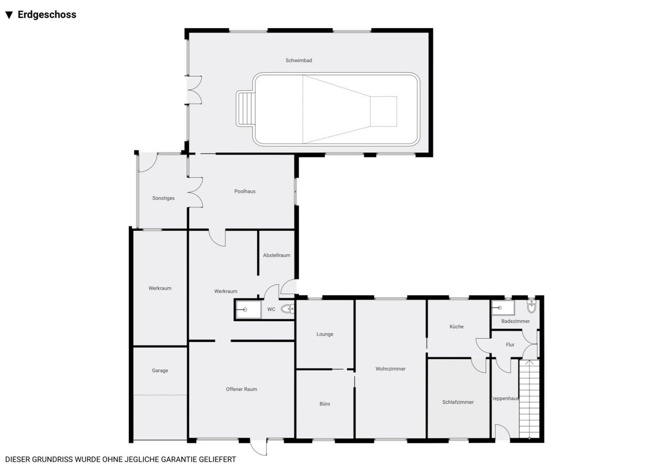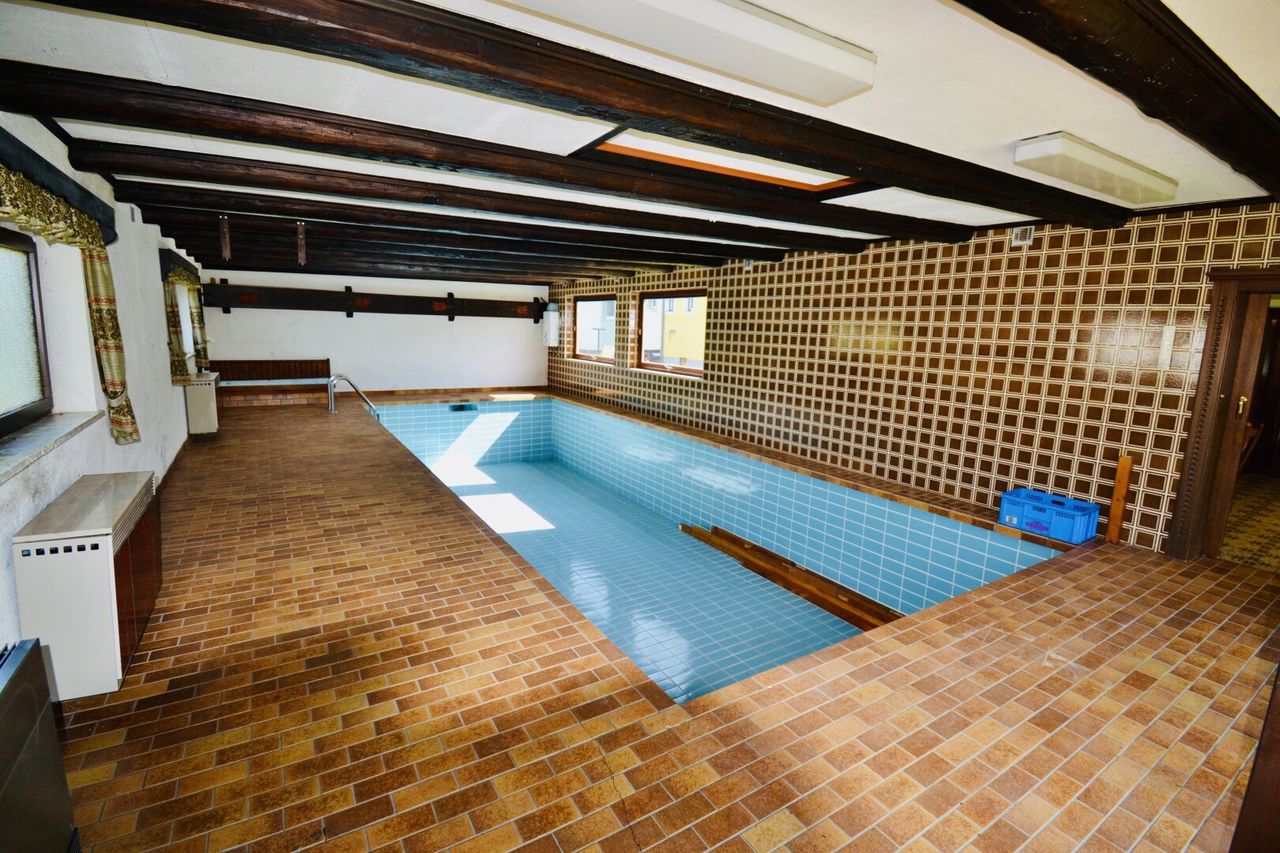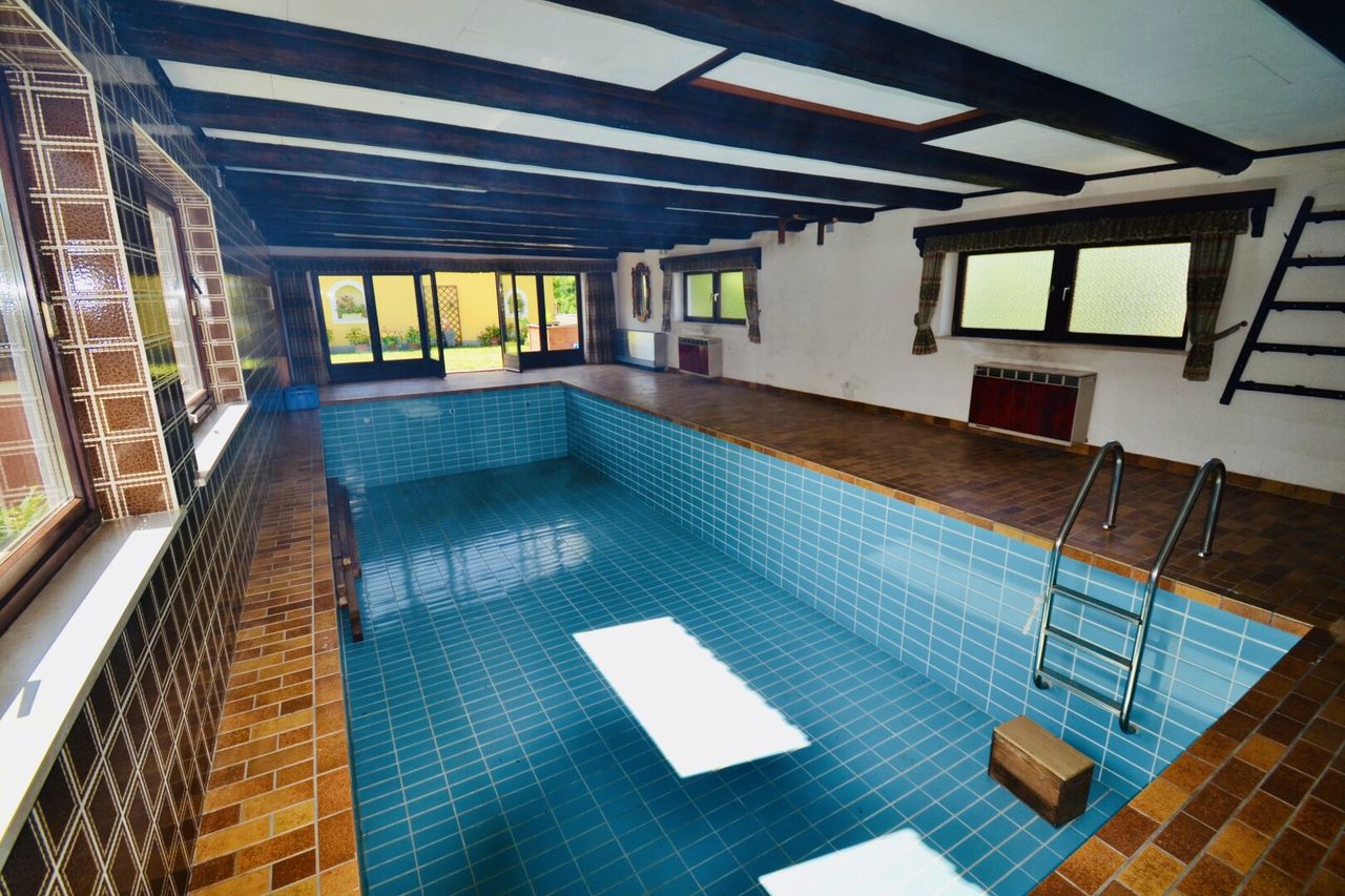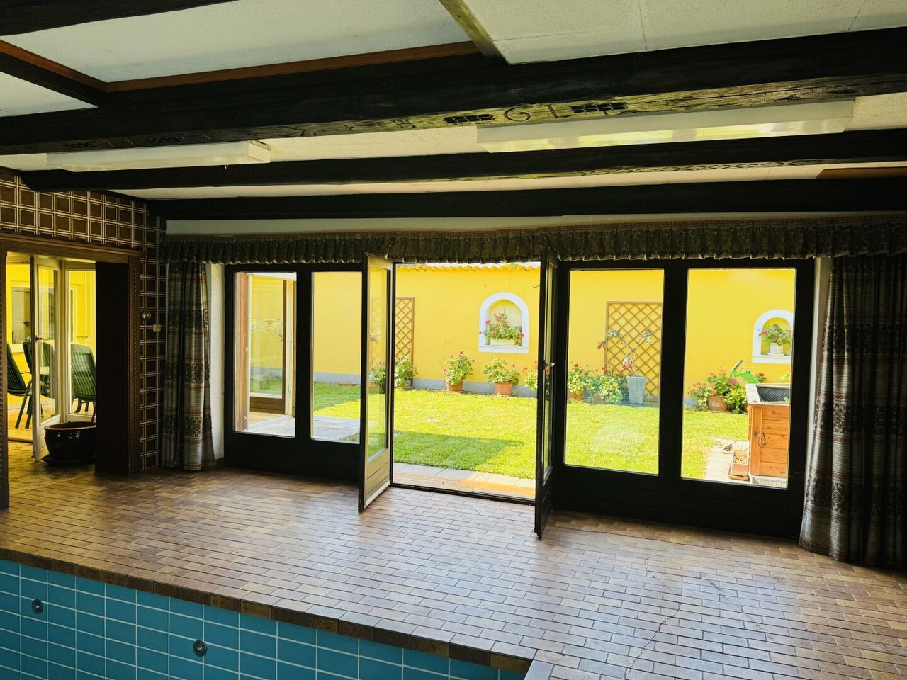 Ein absolutes Highlight dieser Etage ist der Zugang zum Hallenbad, das sich in einem eigenen, ca. 84 m² großen Raum befindet. Das Schwimmbecken misst 10 x 4 Meter und stammt aus dem Jahr 1976. Direkt anschließend liegt ein weiterer Raum, der sich hervorragend als Wohnlounge oder Ruhezone nutzen lässt. Durch eine großzügige Doppelglastür gelangt man in den gepflegten, blickgeschützten Gartenbereich mit Hochbeet, Sitzplatz und angrenzendem Bachlauf, der dem gesamten Außenbereich eine außergewöhnlich entspannte Stimmung verleiht.