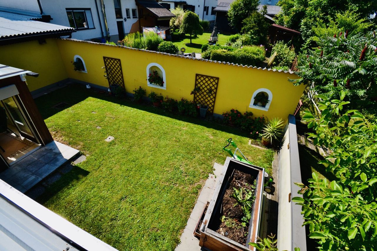 Hinter dem Hallenbad öffnet sich ein weiterer Gartenbereich mit Rasenfläche und einem Tor zur Rückseite des Grundstücks der Zugang zum Bach bietet.