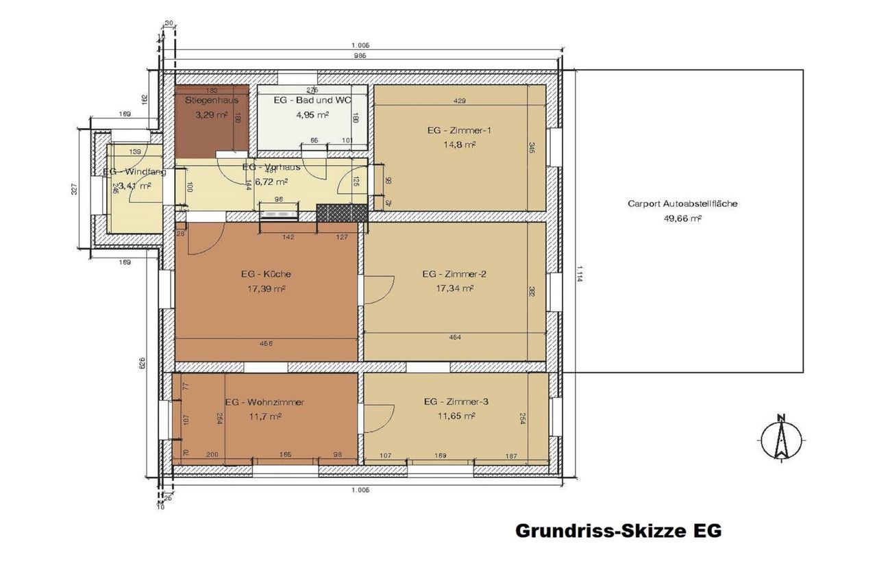 Windfang, Stiegenaufgang, Kellerabgang, Vorraum, Badezimmer inkl. WC, drei separate Zimmer, eine geräumige Küche und ein angrenzender Wohnraum.