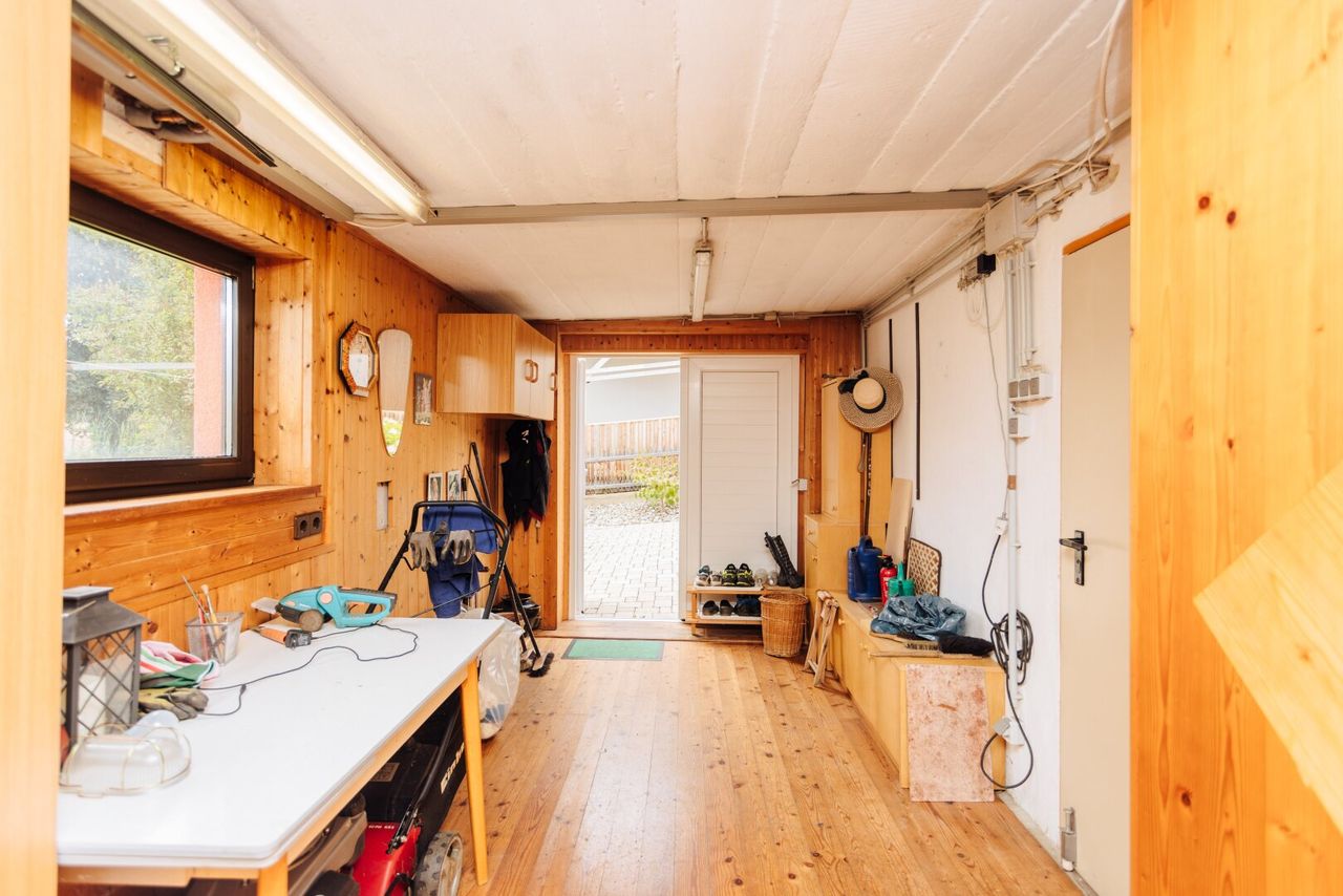 Vorraum, Technikraum mit integriertem Wirtschaftsraum, WC, zwei Lagerräume, eine Werkstatt mit Ausgang nach draußen und zwei große Hobbyräume mit Zugang zum Garten.