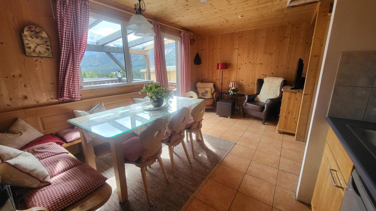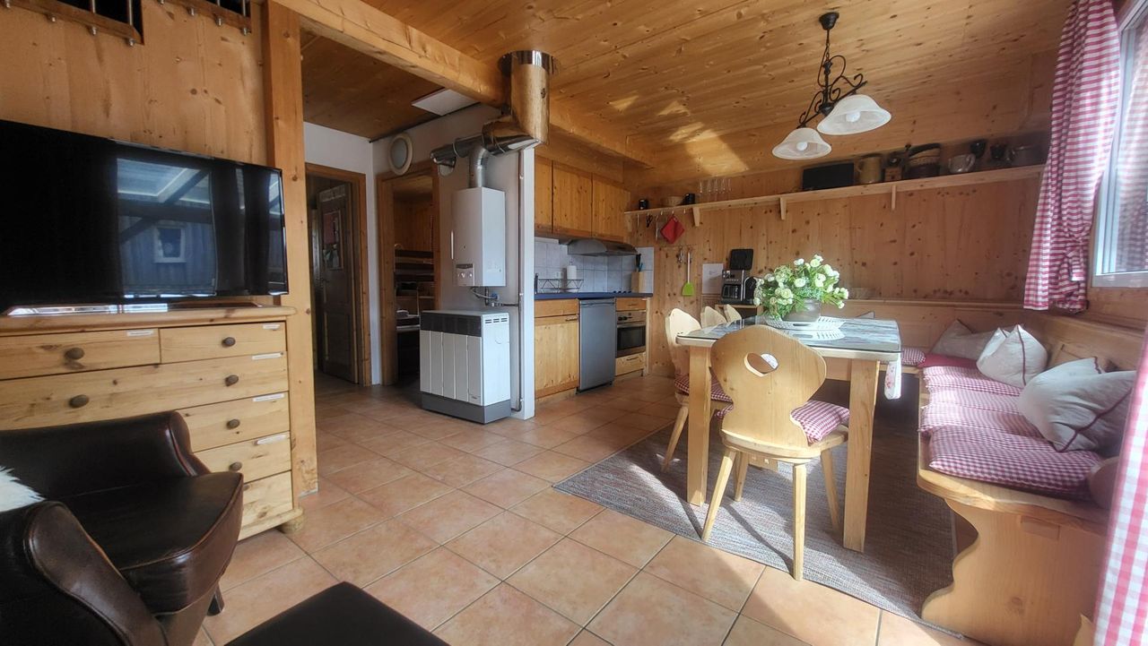 Im Erdgeschoss geht es aus dem Eingangsbereich mit dem kleineren Bad inklusive Dusche in den Wohn- und Essbereich und die Küche mit Spüle, Herd, Backofen, Mikrowelle sowie allem Zubehör für bis zu 8 Personen. Ebenfalls im Erdgeschoss liegt eines der 4 Schlafzimmer. Eine teilüberdachte Terrasse zeigt einen traumhaften Blick auf die 2.000er Berge in der Umgebung.