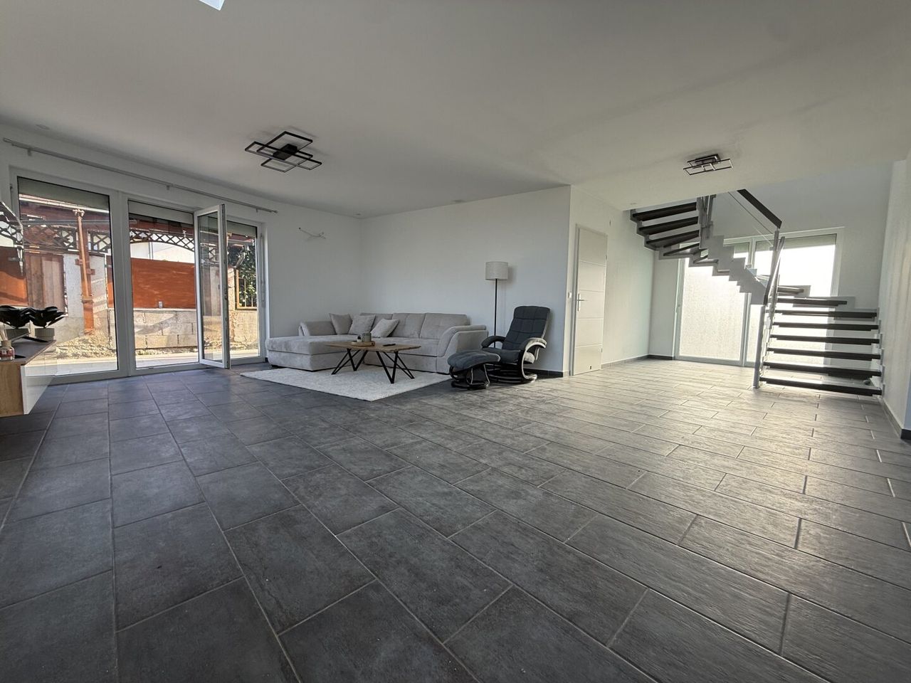 Die großen Fensterflächen im gesamten Haus sorgen für viel Tageslicht und schaffen eine helle und freundliche Wohnatmosphäre. Die Terrasse bietet den idealen Platz für gesellige Abende mit Familie und Freunden oder ruhige Stunden in der Natur.