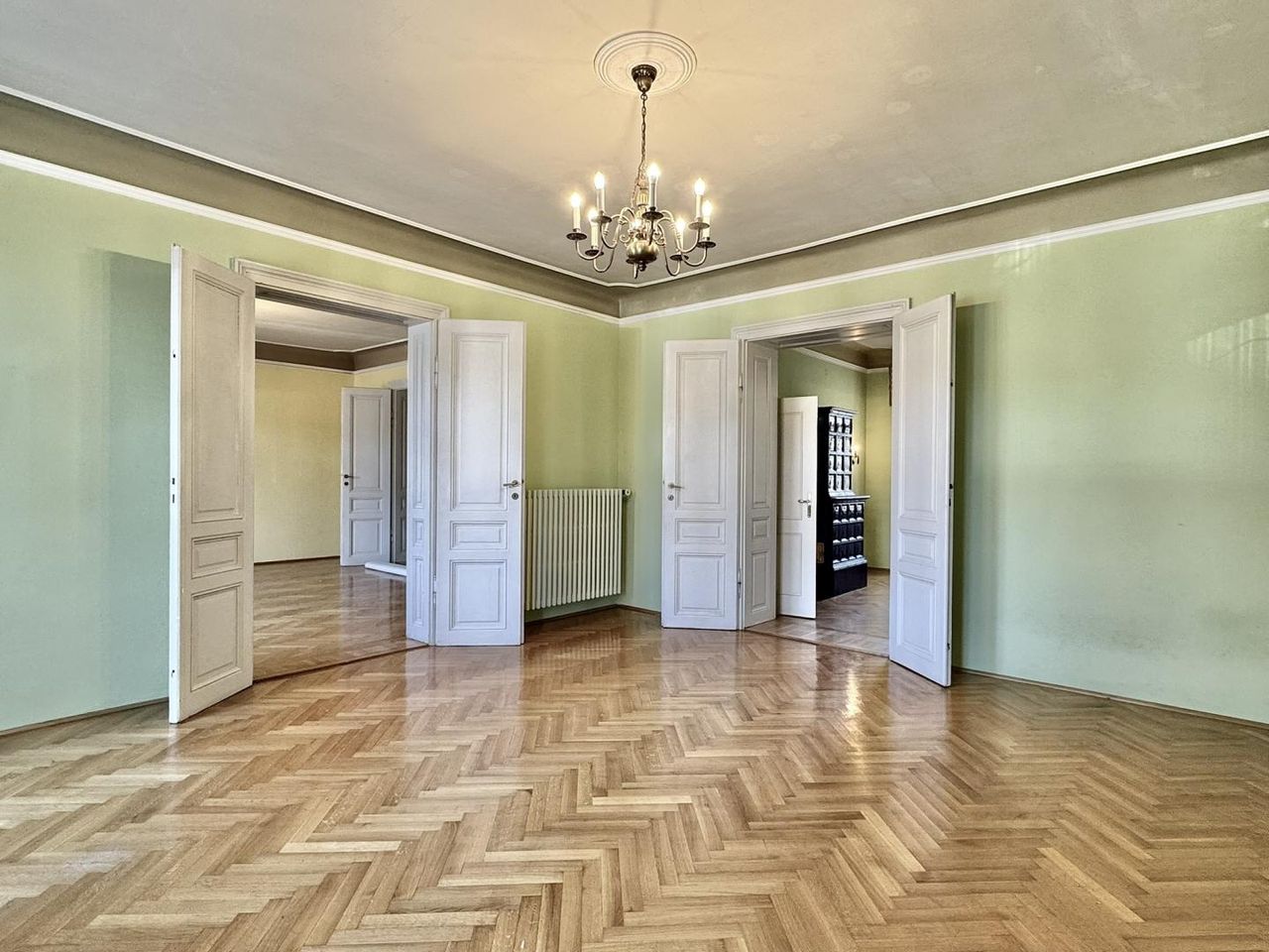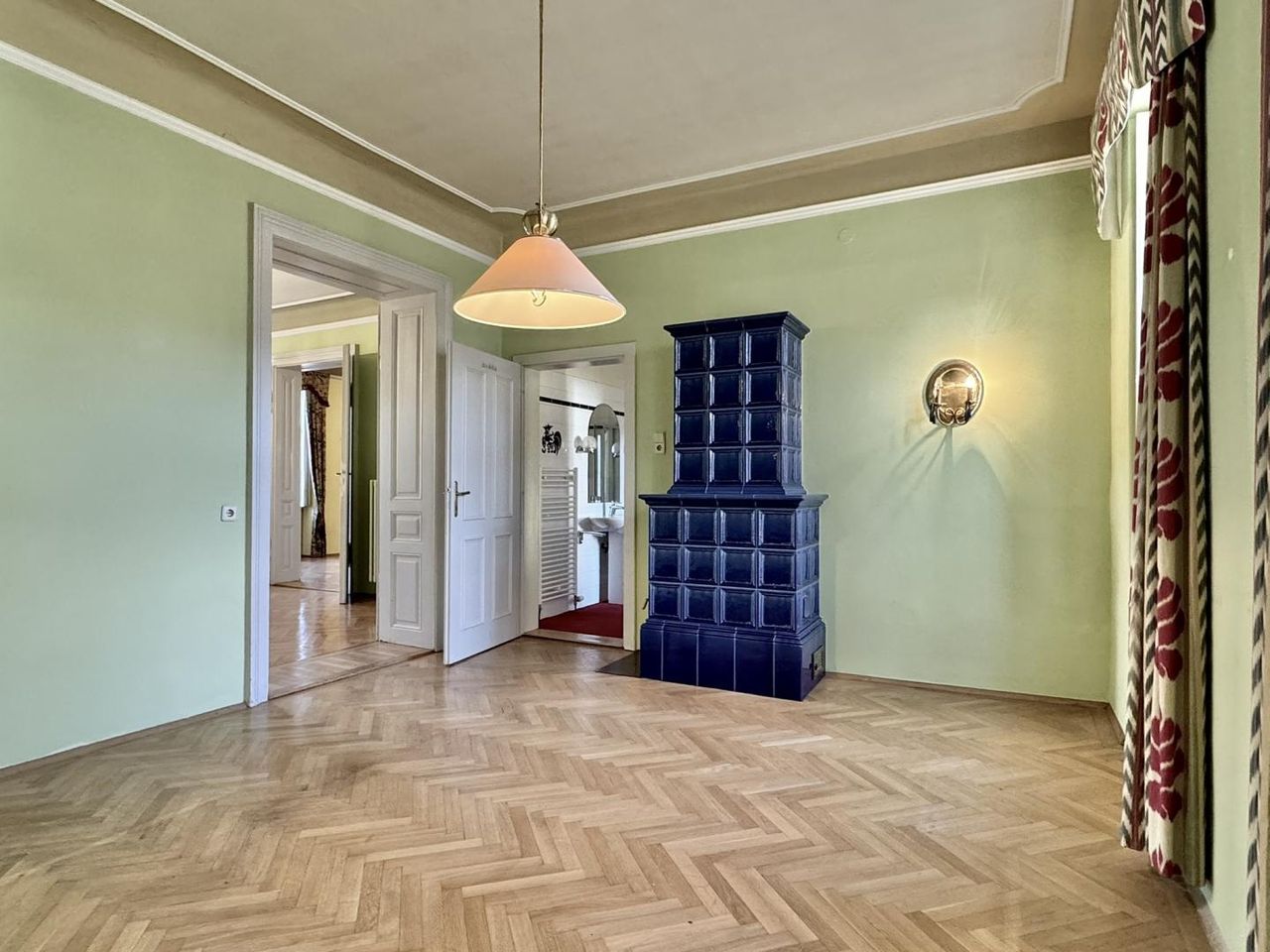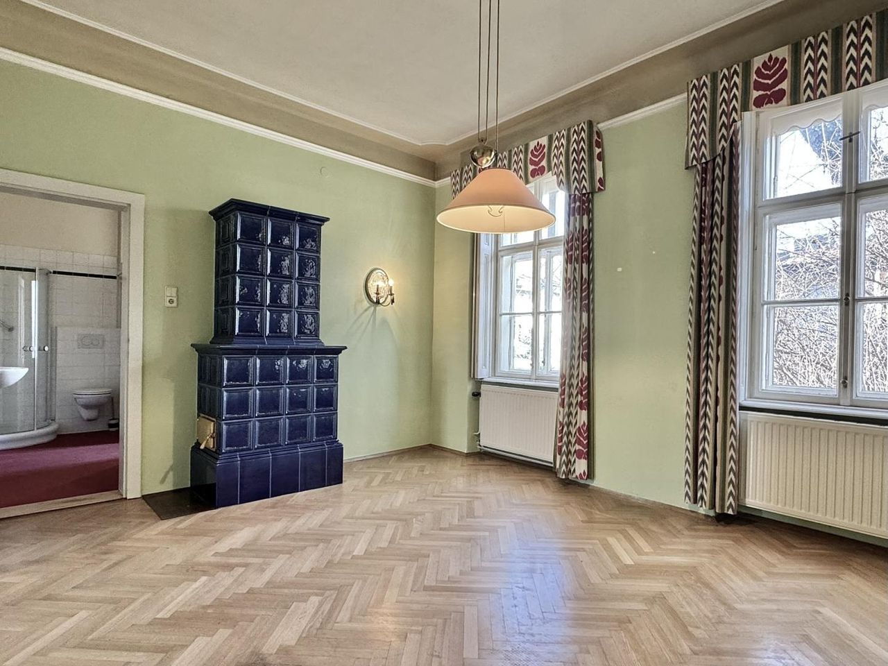 Das Haus besticht durch seinen charmanten Charakter und vielfältige Ausstattungsmerkmale wie Fischgrät-Parkett, oder einem Kachelofen, die den Räumen eine behagliche Atmosphäre verleihen. Flügeltüren und Kastenfenster sorgen für ein angenehmes Raumklima und viel Tageslicht. Im Erdgeschoß der Wohneinheit finden wir drei große Zimmer, Küche und Badezimmer, über eine Treppe gelangen wir in einen Zwischenstock, in dem es eine weitere Toilette gibt. Von hier können wir auch die kleine Terrasse betreten. Einen Halbstock höher finden wir dann ein weiteres Zimmer, einen großen Abstellraum, sowie den Zugang zum großen Dachboden.