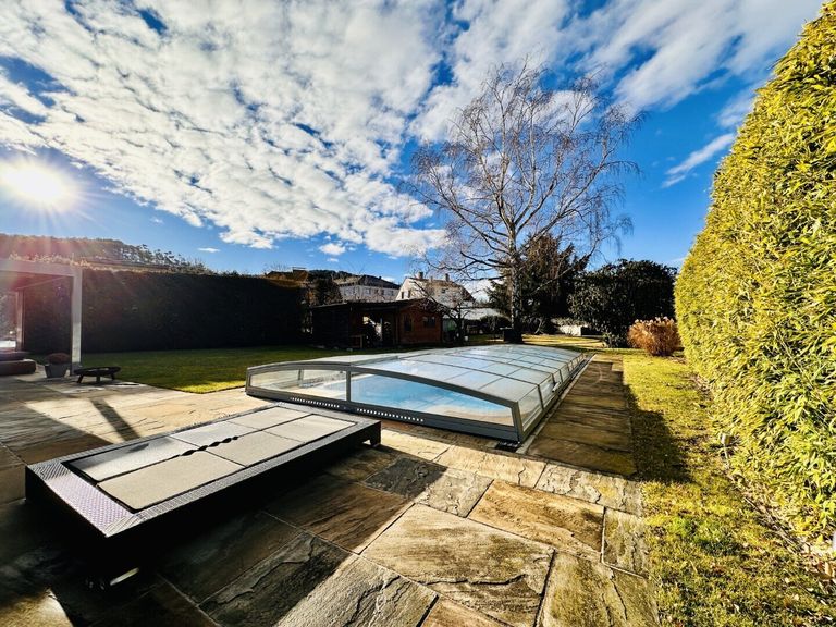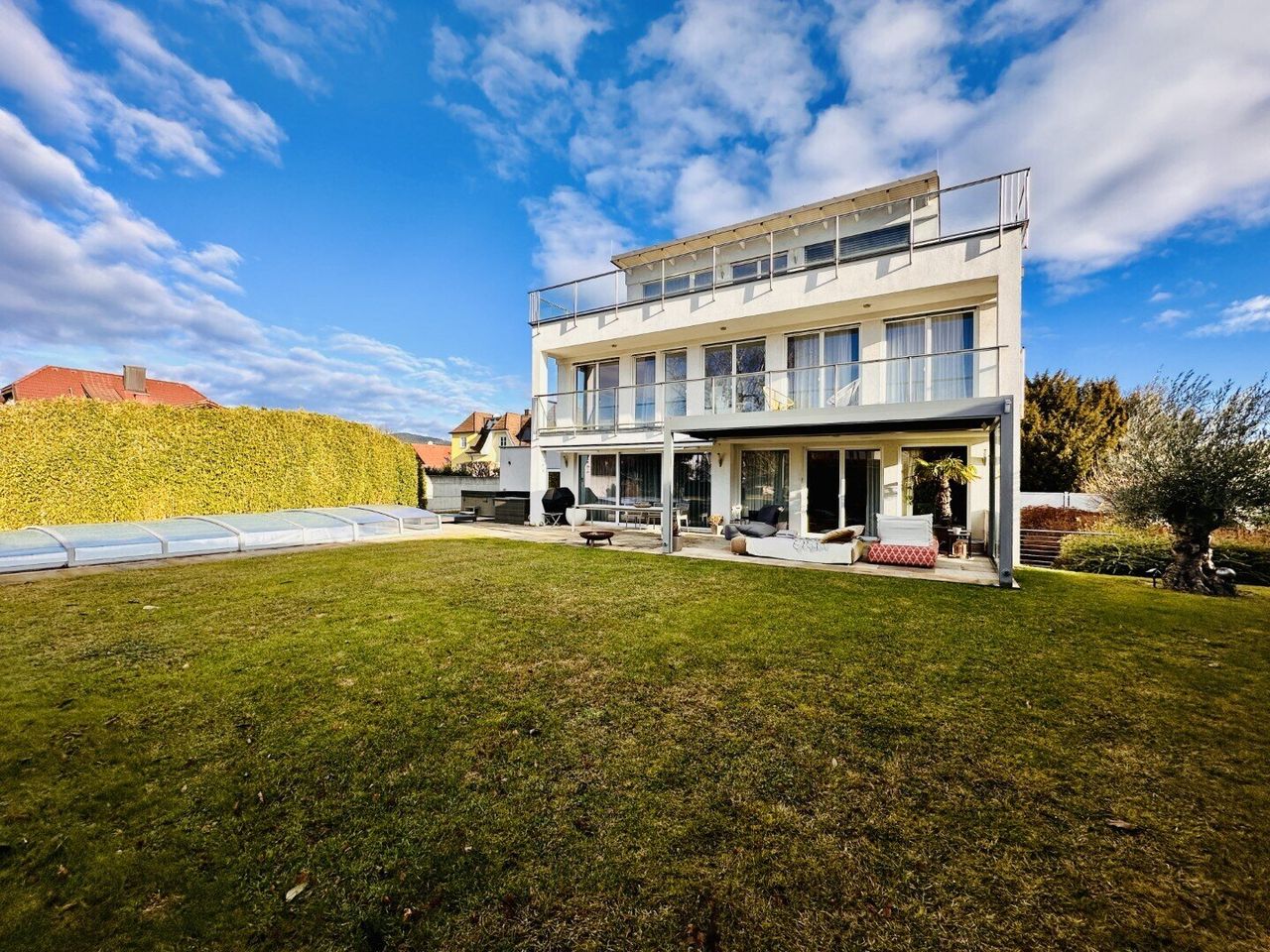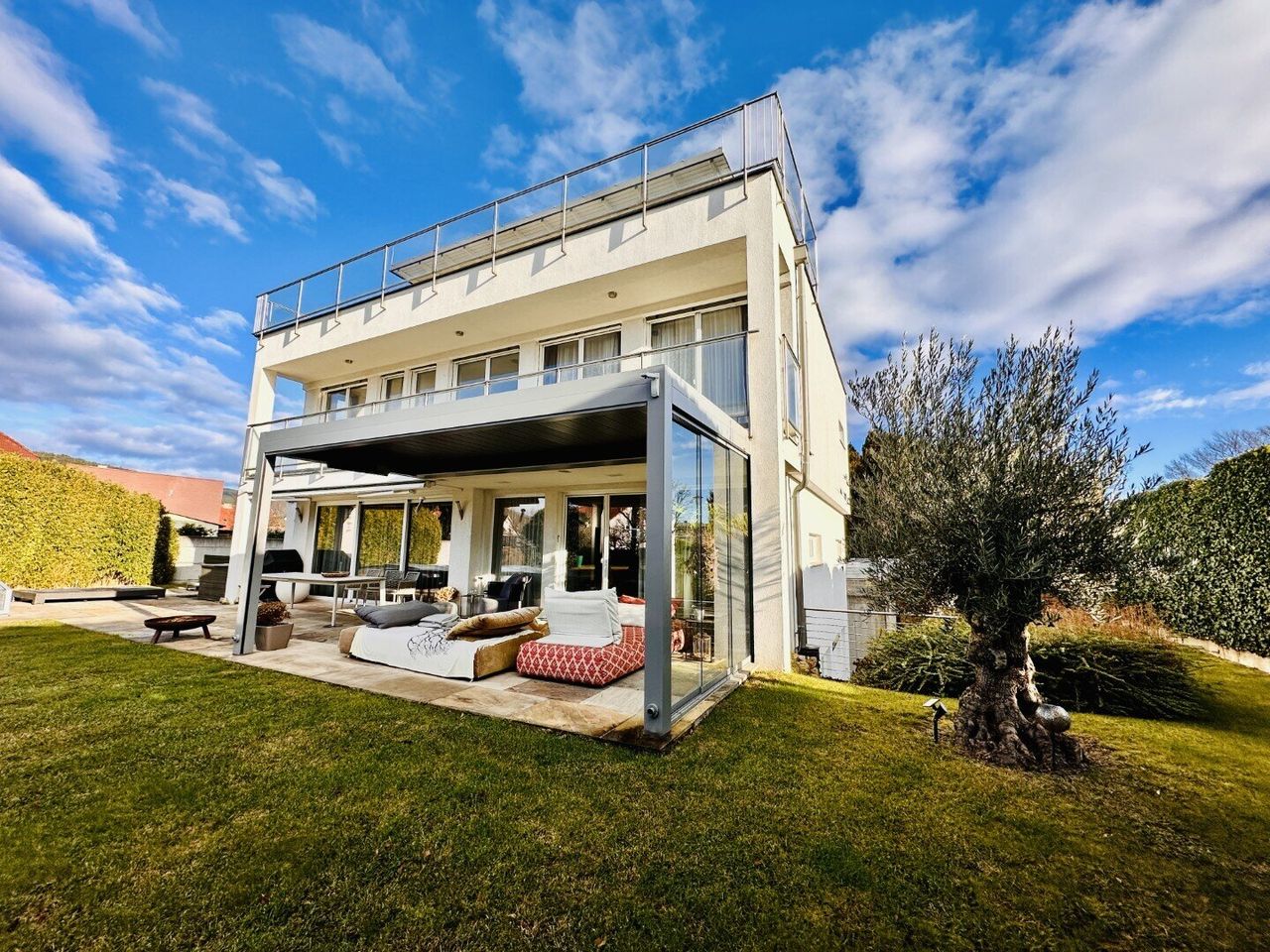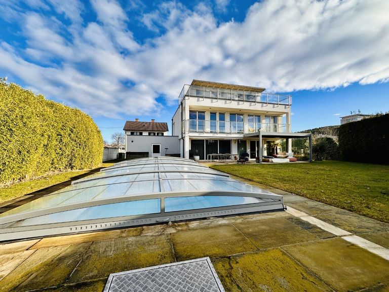 Dieses sehr gut durchdachte, gemütliche Zuhause bietet eine Wohnnutzfläche von rund 320 m² (inkl. Wohnkeller) und eine Grundstücksfläche von 1.192 m² mit Dachterrasse und einen bezaubernden Ausblick auf den Schneeberg. Der großzügige Garten mit einem 28 m² großen, beheiztem Pool sowie teilweise überdachtem Outdoorbereich ist der perfekte Ort für Entspannung und gemütliche Abende mit Freunden und Familie. Die Kirsche auf diesem raffinierten Sahnestück sind die günstigen Betriebskosten mit € 155,-- monatlich.
