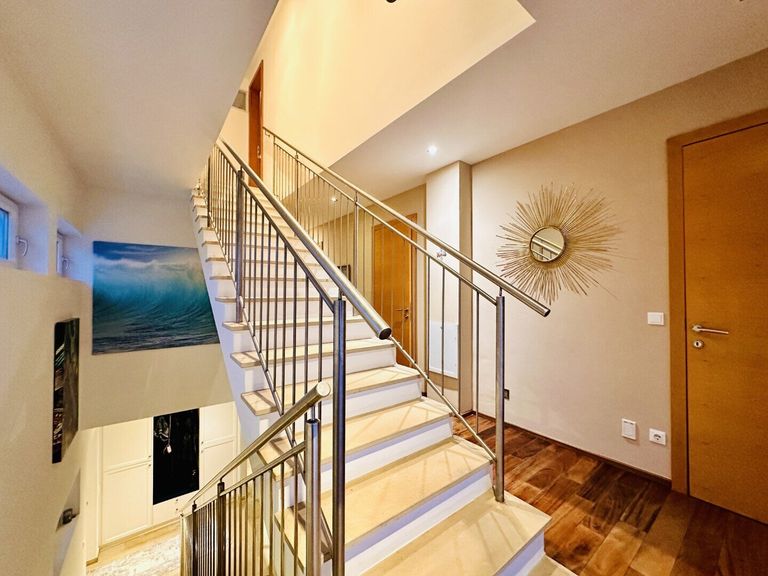 Das Haus ist mit einer Fußbodenheizung ausgestattet, die von einer Wasser zu Wasser Wärmepumpe betrieben wird. Die elektrischen und zentral steuerbaren Außenjalousien sorgen für ein optimales Spiel von Licht und Schatten. Eine Klimaanlage, welche sich im obersten Stock befindet, sorgt für angenehme Kühle an heißen Sommertagen.