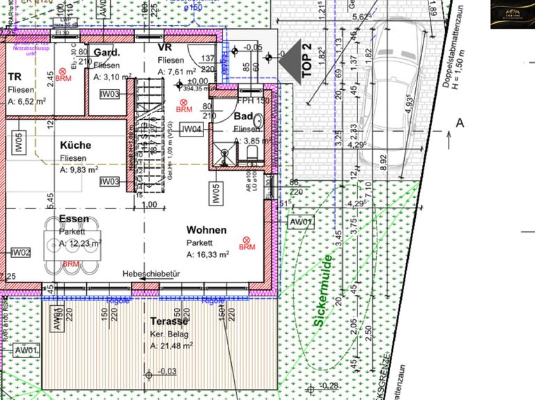 Eine 30 m² große Garage (Top 1) und ein 25 m² großer Stellplatz (Top 2) direkt an der Immobilie sorgen dafür, dass Sie immer einen sicheren Platz für Ihr Auto haben und somit stressfrei in den Tag starten können.