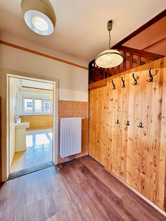 Bereits beim Betreten des Hauses empfängt Sie ein zentraler Vorraum mit Garderobe, der alle Räume im Erdgeschoss miteinander verbindet. Auf dieser Ebene befinden sich zwei Zimmer sowie ein zusätzliches Kabinett, die sich flexibel als Schlafzimmer, Kinderzimmer, Büro oder Gästezimmer nutzen lassen. Das geräumige Badezimmer mit Waschbecken und Dusche bietet angenehmen Komfort, während das separat gelegene WC für zusätzliche Praktikabilität sorgt.