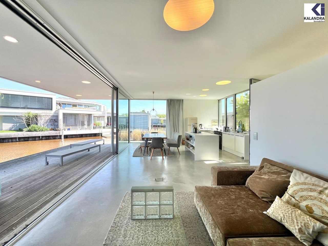 Vorraum, großes Wohn-& Eßzimmer mit offener Küche (ca. 44m²) und Ausgang in den Innengarten sowie auf die ca. 40m² große, westseitige Seeterrasse mit Bootsanlegestelle, 2 Schlafzimmer (ca. 10m² & 12m²) sowie ein Badezimmer mit Wanne und ein separates WC;