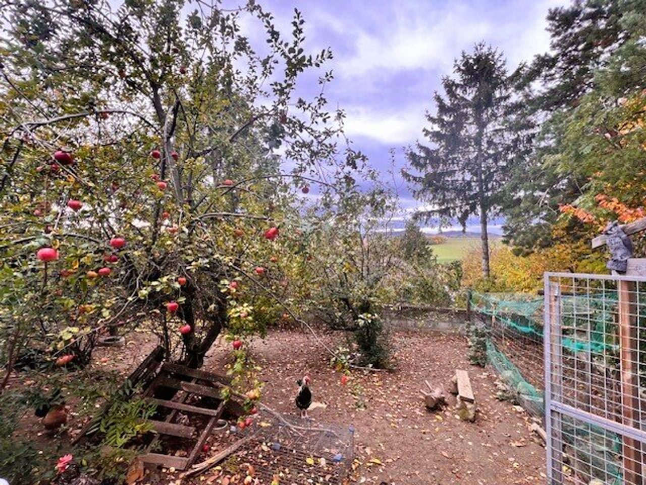 Der Garten ist in 3 Ebenen unterteilt und besteht aus einem Hühnerstall mit Auslauffläche und Altbaumbestand (Apfel, Birnen, Zwetschken und vielem mehr...) einem Gemüsegarten und einer Grünfläche.