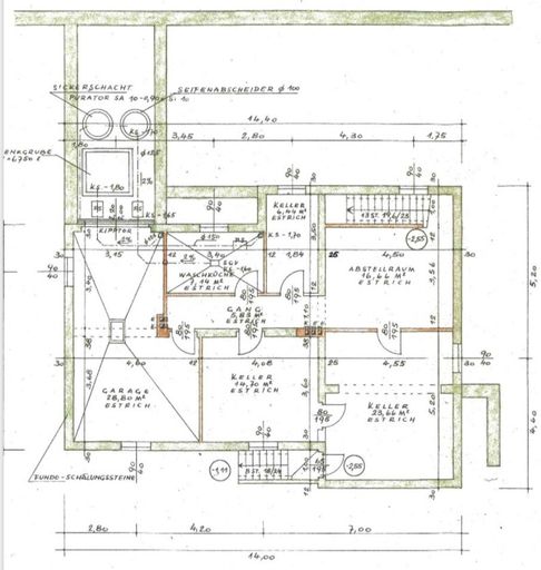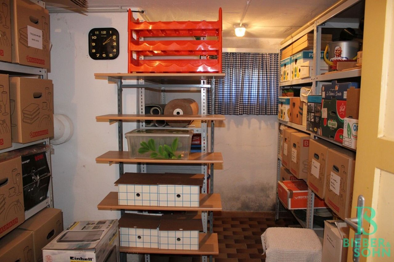 Über dem Vorraum aus ist des Weiteren der separate Kellerabgang vorzufinden, welcher in ein geräumiges Vorzimmer im Keller führt. Vom Vorzimmer aus ist der Keller kreisförmig über alle Zimmer zu begehen – eine große Bauernstube, eine Tee-Küche, ein kleiner Werkraum, ein riesengroßer Abstellraum (ehemalige Garage), eine Waschküche mit Wanne und ein kleiner Gang, von dem aus eine großzügige Speis und wiederrum das geräumige Vorzimmer zu erreichen sind. Leider dürften die Kellerwände, Hangseitig, ein leichtes Feuchtigkeitsproblem aufweisen!