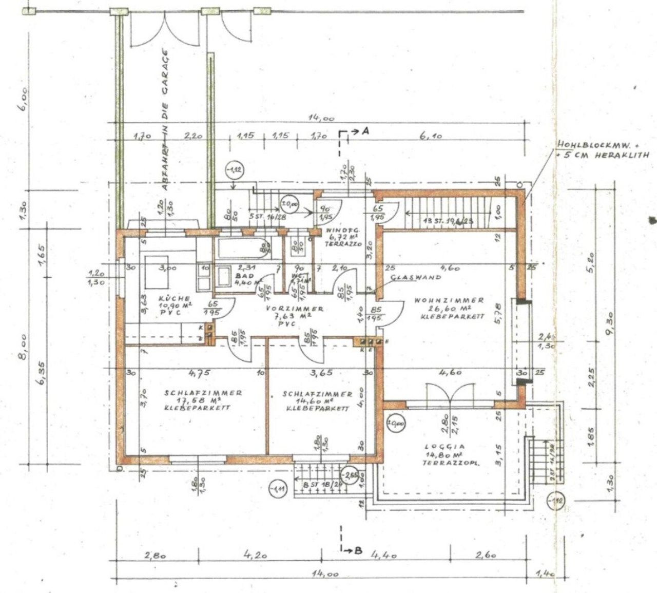 Die Ausstattung ist dem alter entsprechend aber in einem guten und gepflegten Zustand! Von Steinboden, Parkett, Fliesen und Linoleum ist alles vorhanden… und die Küche, sowie die Nassräume lassen die 60er Jahre wieder auferstehen. Nordseitig bestehen noch Verbundfenster mit Alu-Jalousien aber der Wintergarten, das Ostfenster und die Südfenster sind bereits mit 2-Fach-Isolierung und jedes Fenster mit elektrischen Außenjalousien versehen.
