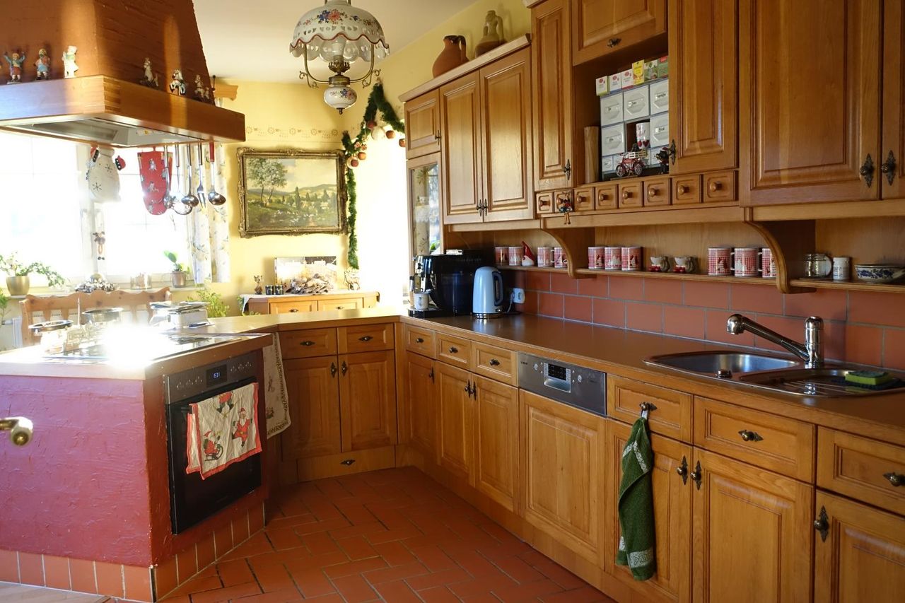 Die massive, vom Tischler maßgefertigte Eichenholz-Küche bildet das Herzstück des Hauses.