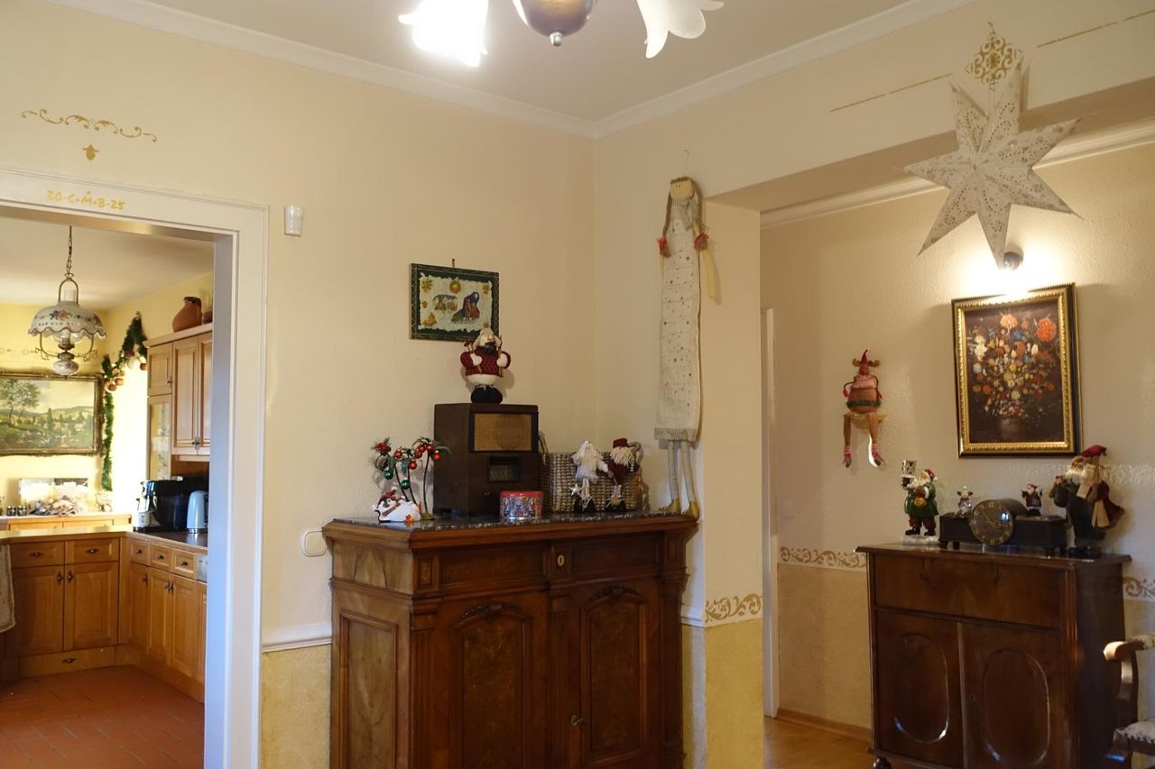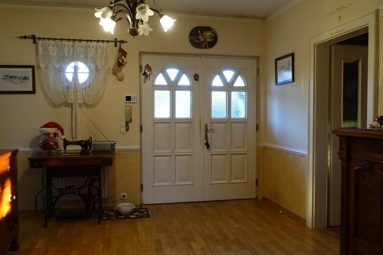 Über den einladenden Außenbereich, der mit Säulen geschmückt ist, gelangt man durch eine Doppeltür in das Haus. Vom großzügigen Vorraum erreicht man das derzeitige Büro, den Wohnbereich, alle weiteren Räume sowie das Kellergeschoss, den Dachboden sowie die anschließende Garage.
