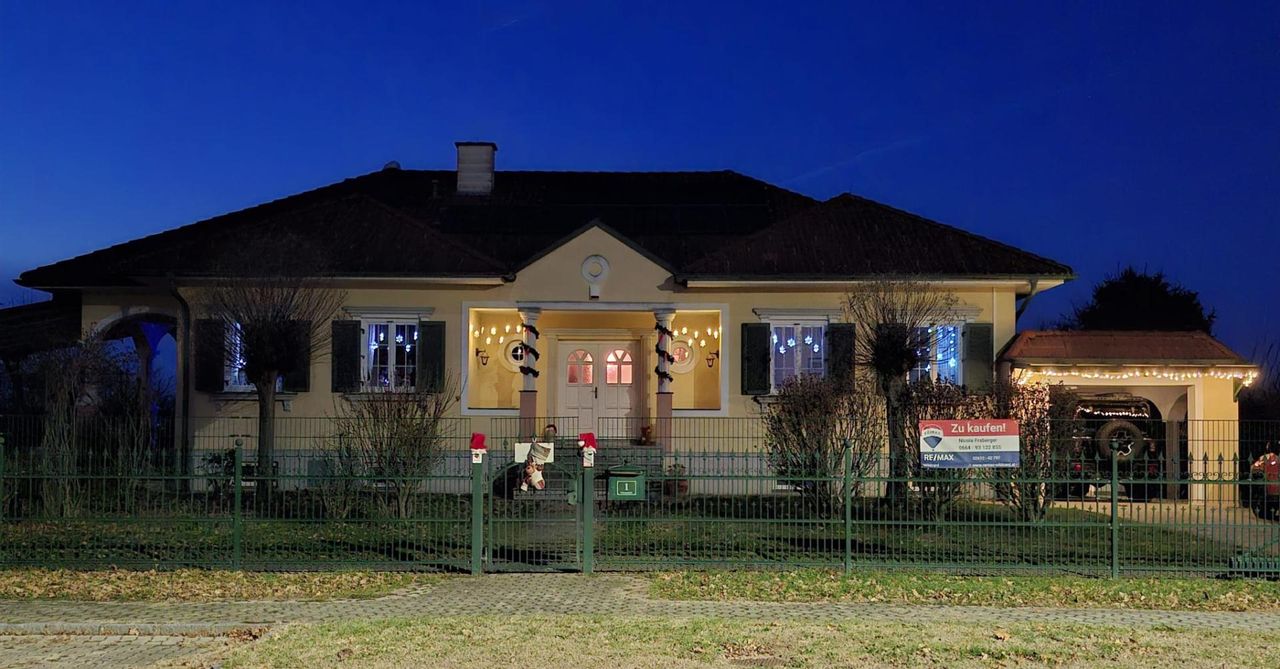 Dieses Haus verbindet hochwertige Architektur mit einem Grundstück, das man heute kaum mehr findet – und das alles in einer wunderschönen Lage mit einem Naturpool, der wie eine kleine private Wellness-Oase wirkt. Über den einladenden Außenbereich, der mit Säulen geschmückt ist, gelangt man durch eine Doppeltür in das Haus. Vom großzügigen Vorraum erreicht man das derzeitige Büro, den Wohnbereich, alle weiteren Räume sowie das Kellergeschoss, den Dachboden sowie die anschließende Garage. Die Räume erstrahlen durch hochwertigen Gipsstuck an Decken und Wänden, Echtholzparkett, edle Fliesen und Marmor. Die massive, vom Tischler maßgefertigte Eichenholz-Küche bildet das Herzstück des Hauses. Im Wohnbereich wurde...