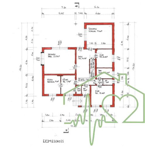 Im Erdgeschoss sind folgende Räumlichkeiten vorhanden: Windfang, Flur, WC, Bad, Wohnzimmer, Küche, Esszimmer, Eltern-Schlafraum, Kinder-Schlafraum, Gäste-Schlafraum sowie eine Terrasse. Die Terrasse ist teilweise durch den auskragenden Dachstuhl überdacht....