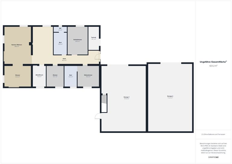 Auf einer Wohnfläche von rund 202,90 m² im Erdgeschoss sowie einer beeindruckenden Garage mit ca. 220,20 m² bietet die Immobilie reichlich Raum für individuelles Wohnen und komfortables Leben für die ganze Familie.