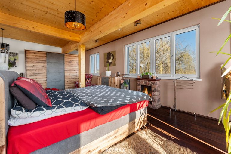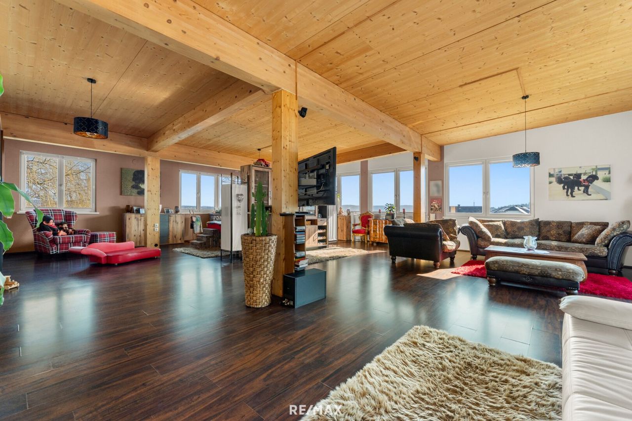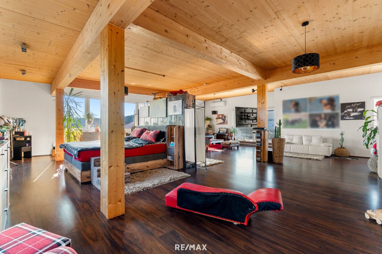 Im Zuge der Erweiterung im Jahr 2008 entstand im Obergeschoss ein großzügiger, offen gestalteter Wohnbereich mit viel Tageslicht. Von hier aus bietet sich bei klarer Sicht ein beeindruckender Blick bis zum Geschriebenstein. Zusätzlich befindet sich auf dieser Etage ein weiterer Raum, in dem eine Infrarotkabine installiert wurde. Von hier gelangt man auch auf den ca. 22 m² großen Balkon, der bereits am Vormittag viel Sonne bietet und einen freien Blick auf die umliegende Natur eröffnet.
