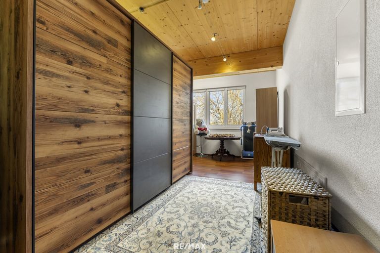 Eine Pelletsheizung sorgt für eine effiziente Wärmeversorgung. Zusätzlich produziert eine Photovoltaikanlage Strom, während Solarkollektoren die Warmwasseraufbereitung unterstützen. Im Erdgeschoss befindet sich ein Kachelofen und im Obergeschoss wurde eine Wandheizung installiert. Eine Klimaanlage sorgt im Sommer für angenehme Temperaturen und kann auch das Erdgeschoss mitkühlen.