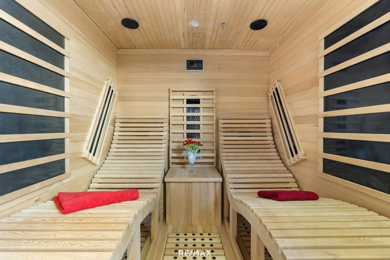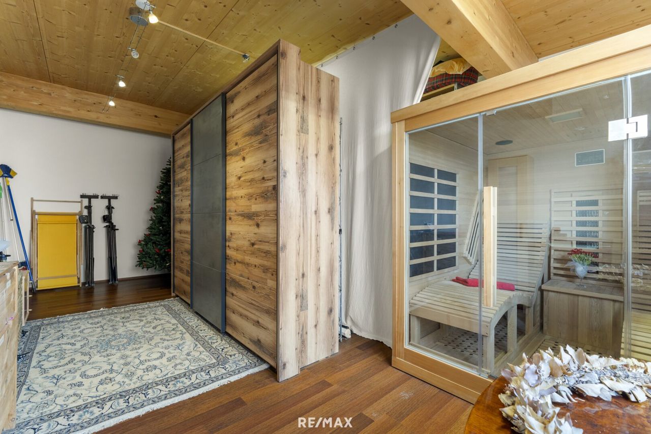 Die Immobilie wird teilweise möbliert übergeben, die Infrarotkabine verbleibt im Haus.