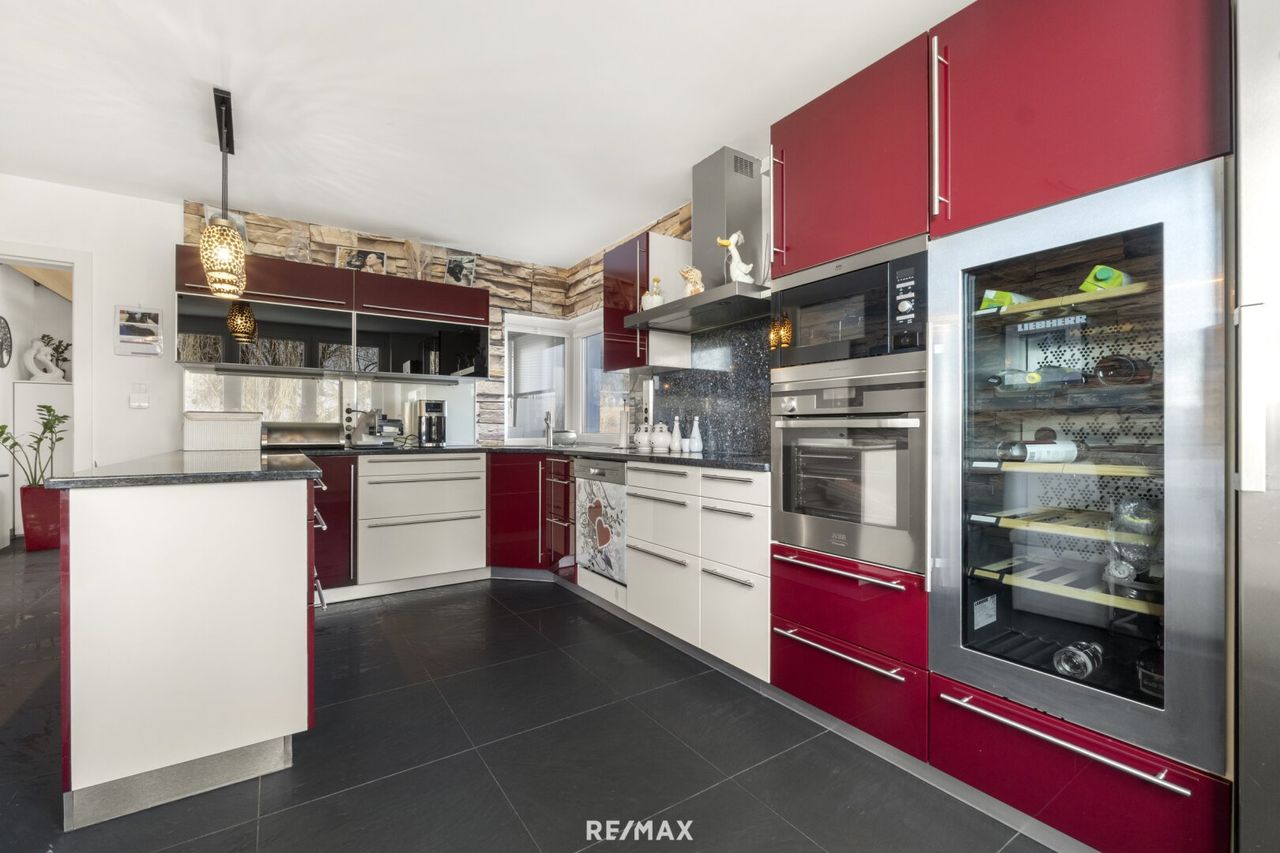 Bereits beim Betreten des Hauses zeigt sich die durchdachte Gestaltung. Der elegante Eingangsbereich ist mit maßgefertigten Einbauschränken möbliert. Die Küche ist vollständig ausgestattet und bietet ausreichend Platz. Vom Essbereich eröffnet sich ein schöner Blick in den Garten und direkt angrenzend befindet sich das großzügige Wohnzimmer mit einem gemütlichen Kachelofen, der besonders in der kalten Jahreszeit für angenehme Wärme sorgt.