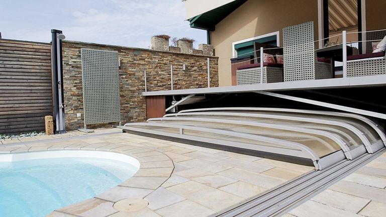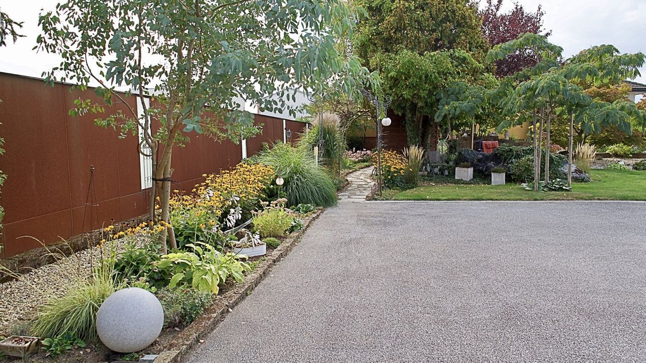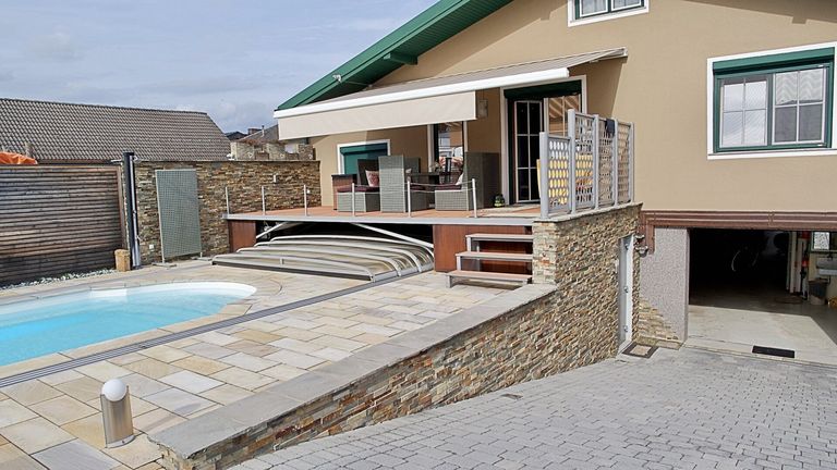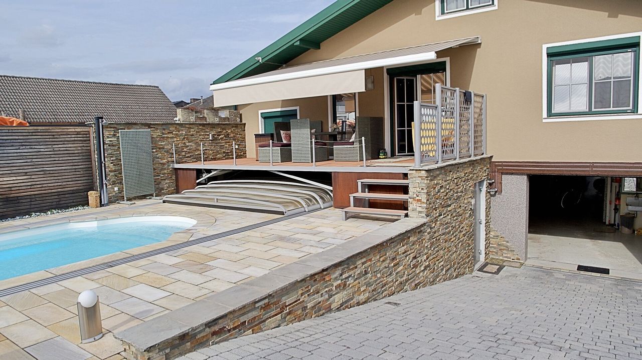 Der Poolbereich bildet das Herzstück der gepflegten Gartenlandschaft. Der beheiz- und beleuchtbare Pool hat eine moderne Überdachung, die sich platzsparend unter die Terrasse schieben lässt. Der Garten selbst begeistert mit liebevollen Details und spürbarer Ruhe: Ob beim Rückzug in eine der Sitznischen, beim Arbeiten in den Hochbeeten oder beim Abendessen im Freien – dieser Außenbereich schafft Raum für echte Lebensqualität.