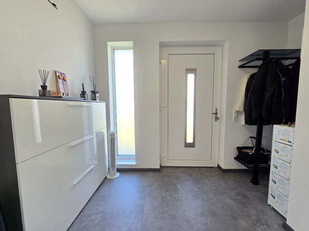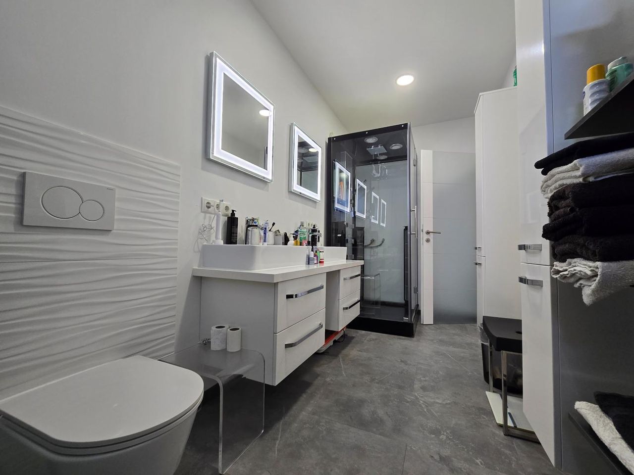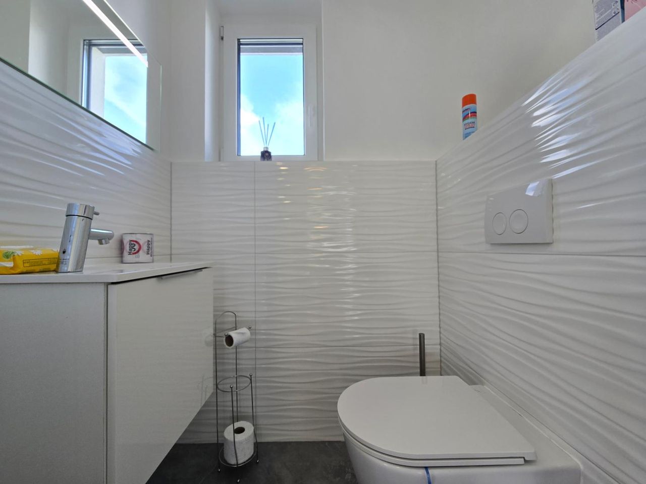 Die Haustechnik ist auf Nachhaltigkeit und Komfort ausgelegt: Eine Luftwärmepumpe mit Fußbodenheizung sorgt für behagliche Wärme, und im Sommer für ein klimatisiertes Haus, während die Photovoltaikanlage mit Speicher die Energiekosten erheblich reduziert. Eine Entkalkungsanlage garantiert bestes Wasser im ganzen Haus.
