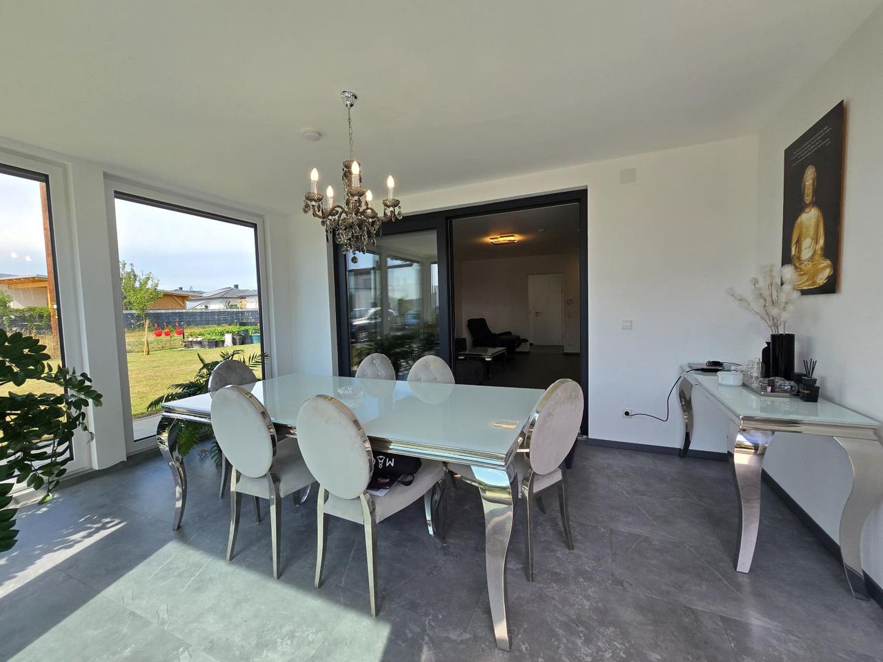 Ein Highlight des Hauses ist der beheizte Wintergarten, der als lichtdurchfluteter Rückzugsort dient und den Blick in den Garten öffnet. Hier lässt sich zu jeder Jahreszeit entspannen, lesen oder gemeinsam Zeit verbringen.