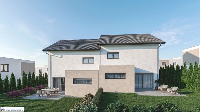 geplant ist ein modernes doppelhaus mit rund 122 m² wohnfläche pro haushälfte.