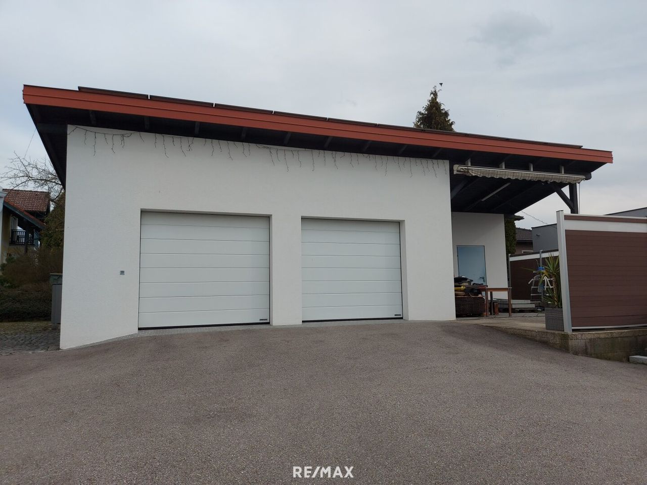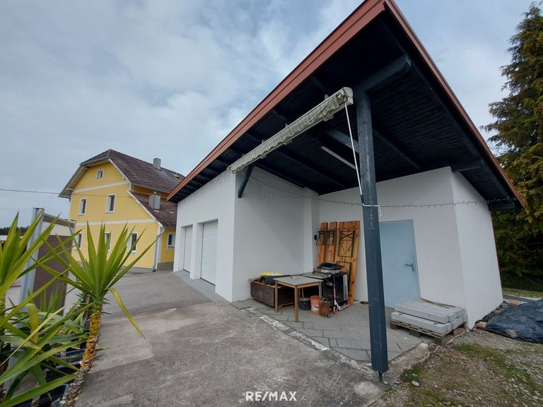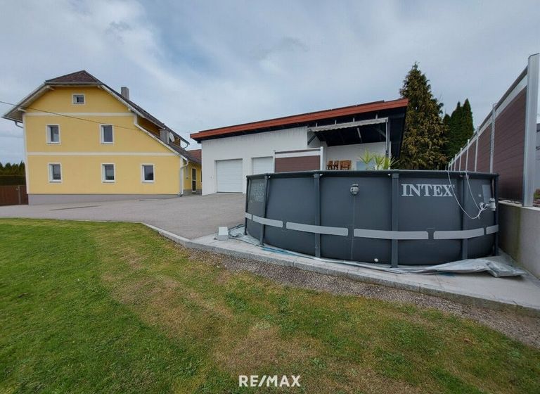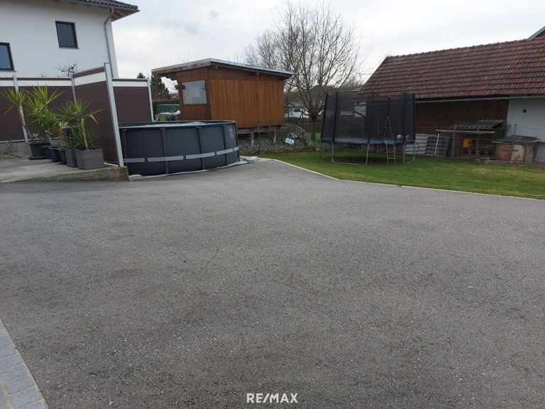 Die Doppelgarage wurde 2024 neu gebaut, mit einen Gartengeräteraum ca.9m², davor befindet sich eine Terrasse und ein Pool.