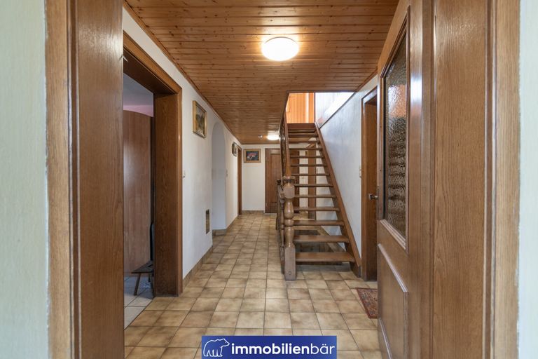 Holztramdecken und die gewachsene Bausubstanz vermitteln einen rustikalen, bodenständigen Wohncharakter. Die Raumhöhen liegen bei ca. 210–215 cm und unterstreichen den Charme eines Hauses aus einer anderen Zeit.