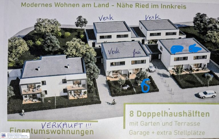 Sehr nettes modernes Wohnen am Land nähe Ried im Innkreis ist nun für sie möglich. Haus 6 = das letzte Doppelhaus zum Wohlfühlen mit sehr schönem sonnigen Grundstück und einem wunderschönen Ausblick. zu einem leistbaren Preis ist frei. SCHLÜSSELFERTIG!!! Die anderen Doppelhaushälften sind bereits verkauft. Bei Fertigstellung 2026 werden ihre Wünsche wahr!