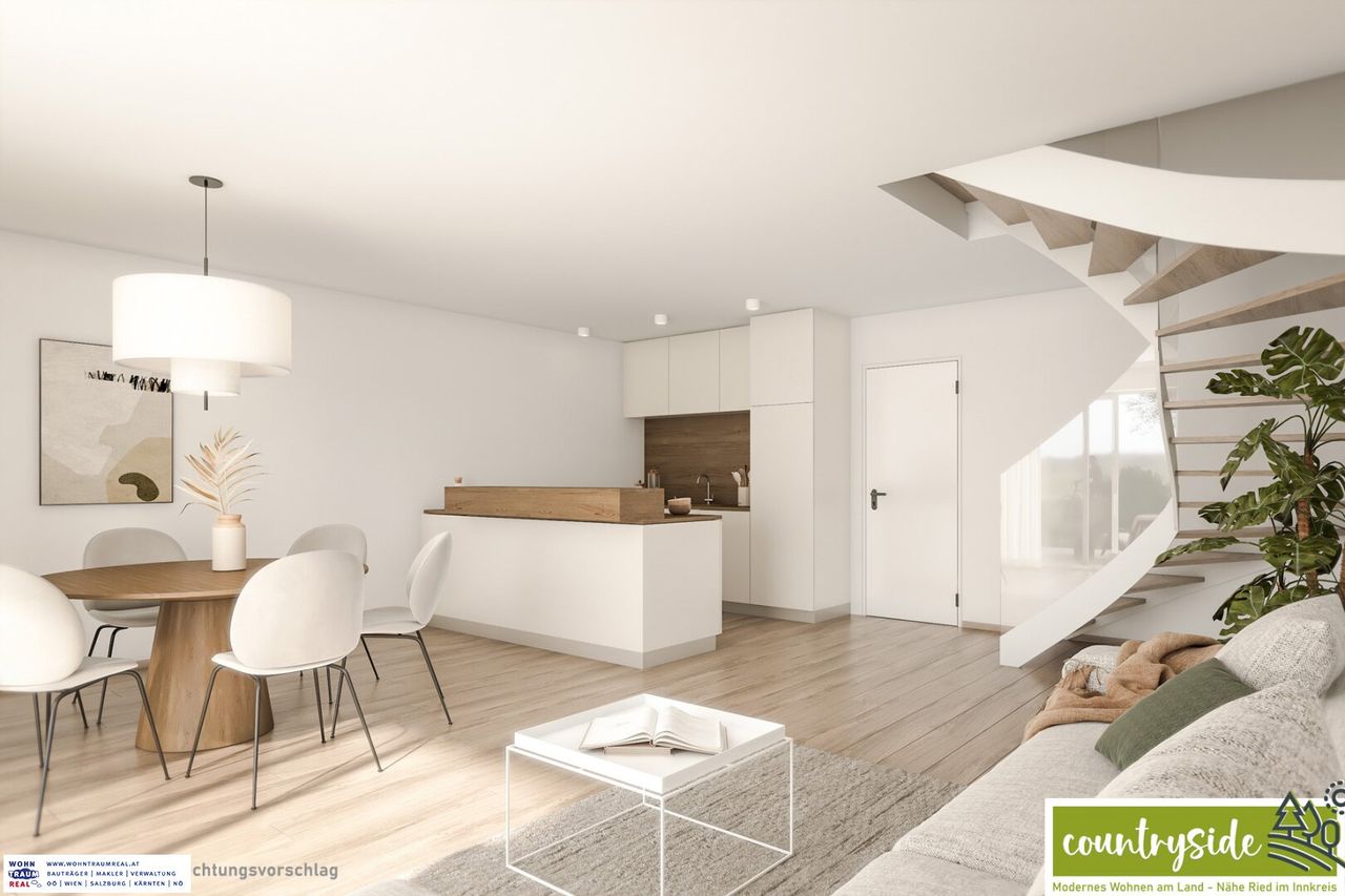 Der Ausblick von der Doppelhaushälfte ist ein wahrer Traum. Sie haben einen unverbauten Grünblick und können die Ruhe und Schönheit der umliegenden Natur täglich genießen. Auch im Inneren des Hauses wurde viel Wert auf eine harmonische Verbindung mit der Umgebung gelegt. Große Fenster sorgen für eine natürliche Belichtung und schaffen eine angenehme Wohnatmosphäre.
