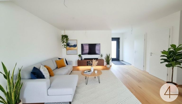 In der unteren Etage befindet sich ein geräumiges Wohnzimmer, das nahtlos in den Essbereich übergeht. Diese offene Gestaltung fördert die Kommunikation und schafft einen einladenden Raum für Familien und Gäste. In Ihrer zukünftigen Küche können Sie ideal für die Zubereitung von Speisen sorgen, und bietet gleichzeitig Zugang zu einer Terrasse mit Gartenbereich, der zum Entspannen und Verweilen einlädt. Große Fensterfronten sorgen für eine helle und freundliche Umgebung, während die offenen Wohnkonzepte sowohl Funktionalität als auch Stil vereinen.