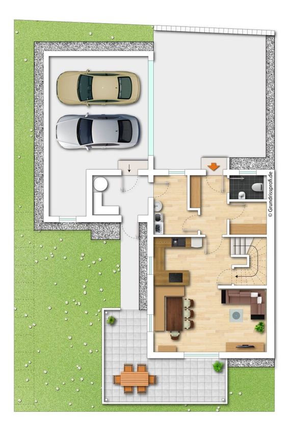Im Erdgeschoss befinden sich eine Doppelgarage, ein Technikraum mit Zugang nach außen, ein Vorraum, ein WC, ein Abstellraum sowie ein großzügiger Wohn- und Essbereich.