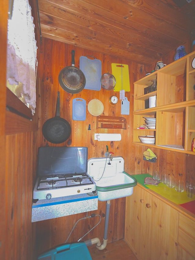 - eine ca. 1,1 m2 kleine kompakte Kochnische mit Gaskocher, Waschbecken und Küchenregalen,