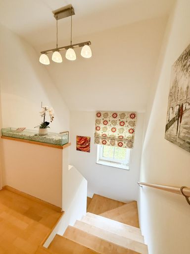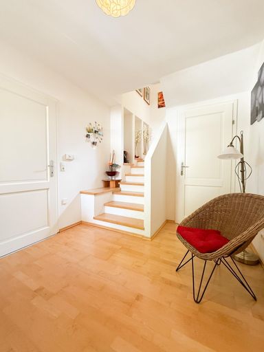 Im Erdgeschoss besticht der lichtdurchflutete Wohn-/Essbereich, der mit einem herrlichen Ofen für behagliche Wärme sorgt. Eine separate Küche mit einer praktischen Speisekammer, ein Gäste-WC, ein Wirtschaftsraum sowie ein Wintergarten, der das gesamte Jahr über naturnahe Momente ermöglicht, runden das Angebot ab. Die überdachte Terrasse bietet eine malerische Aussicht auf die geschmackvoll gestaltete Gartenanlage und lädt zu entspannten Stunden im Freien ein – sei es für gesellige Grillabende oder gemütliche Relaxmomente.