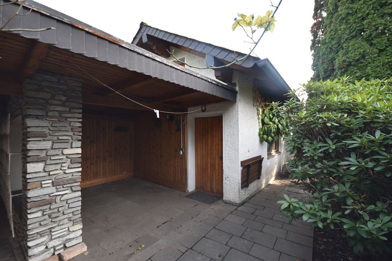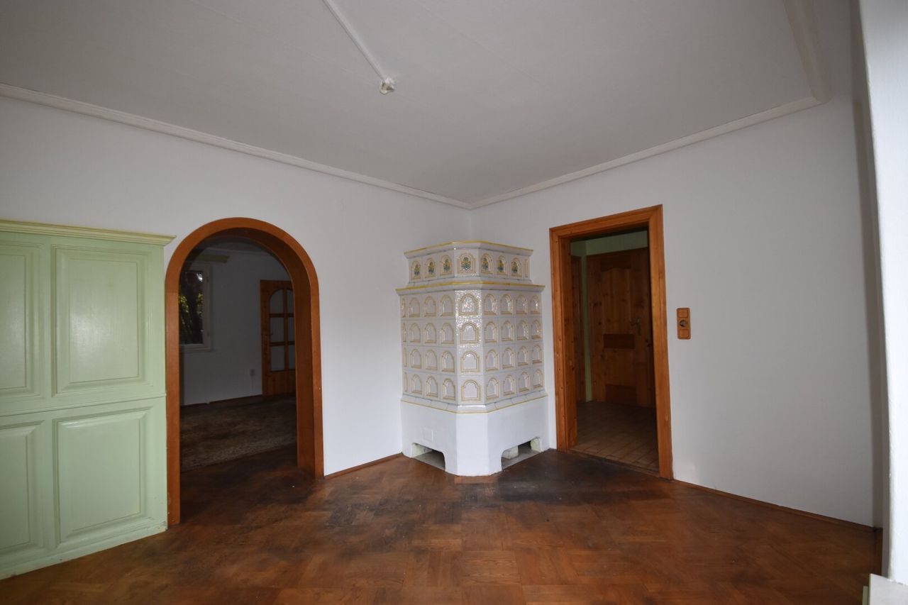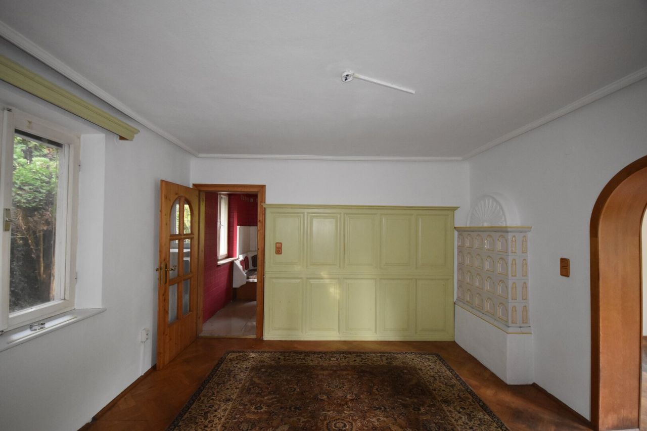 Die Raumaufteilung gliedert sich in Vorraum, Badezimmer mit Dusche und separaten WC, kleinen Abstellraum, sowie Küche mit Stube und einem Esszimmer mit Kachelofen, der ebenso vom Wohnzimmer aus genutzt werden kann. Im ersten Stock befinden sich zwei Schlafzimmer, wobei das eine kleinere Zimmer auch als Büro zu Verfügung stehen könnte. Beide Zimmer haben Zugang zu einem Balkon, der circa 6m² groß ist. Ebenso befindet sich auf dem Grundstück eine ca. 30 m² große Doppelgarage sowie ein separater Einzelstellplatz. Der noch unberührte Garten lädt zur kreativen Gestaltung ein.
