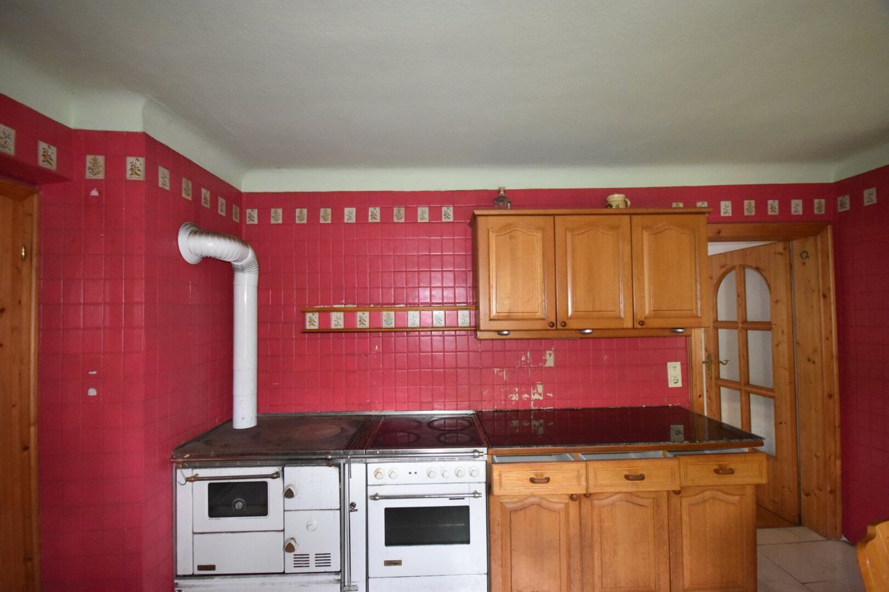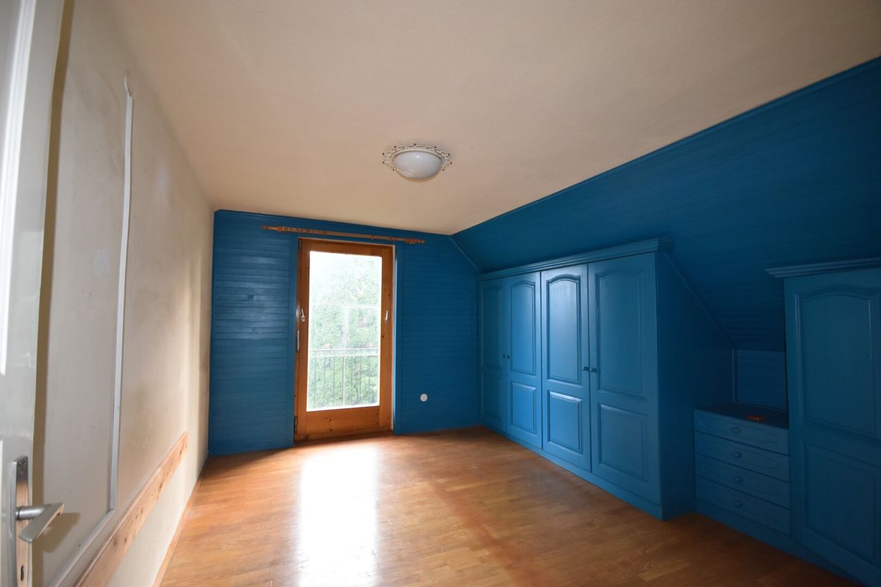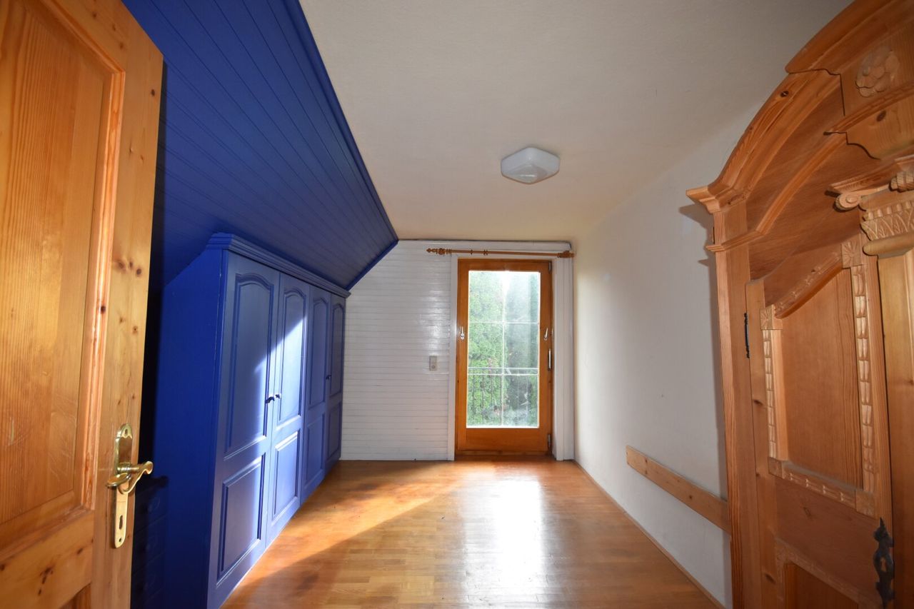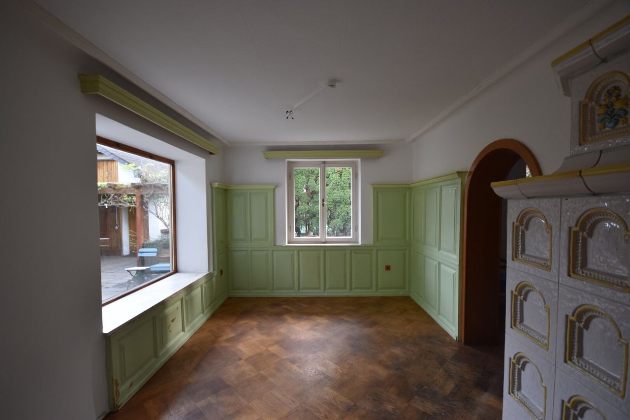 Die Raumaufteilung gliedert sich in Vorraum, Badezimmer mit Dusche und separaten WC, kleinen Abstellraum, sowie Küche mit Stube und einem Esszimmer mit Kachelofen, der ebenso vom Wohnzimmer aus genutzt werden kann. Im ersten Stock befinden sich zwei Schlafzimmer, wobei das eine kleinere Zimmer auch als Büro zu Verfügung stehen könnte. Beide Zimmer haben Zugang zu einem Balkon,...