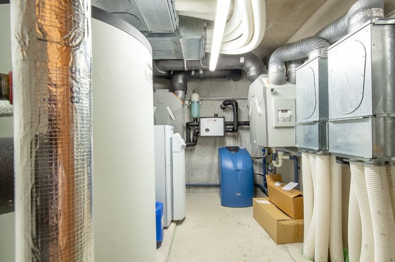 Dass in die Technik entsprechend hineingebuttert wurde, sieht man am Technikraum: Luft-Wärmepumpe, Photovoltaik, Kontrollierte Wohnraumlüftung und Wasseraufbereitung - High-Tech auf höchstem Niveau für ein perfektes Raumklima im Winter und im Sommer.