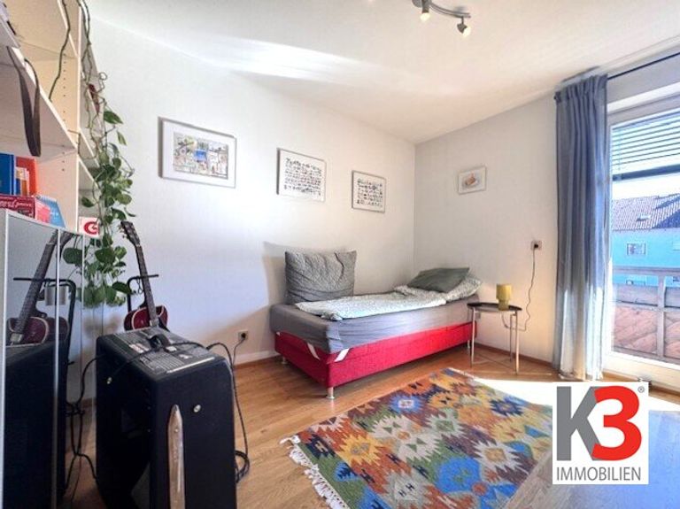 Zimmer ca. 10 m² - Dieses helle Zimmer verfügt ebenso wie der Flur über einen direkten Zugang auf die ca. 5 m² große Loggia. Von hier aus bietet sich ein herrlicher Grün- und Bergblick sowie ein schöner Blick auf die Kirche von Wals.