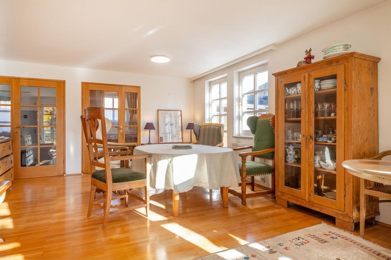 Das Herzstück bildet der großzügige Wohn- und Essbereich mit direktem Zugang zum ca. 8 m² großen Wintergarten, der den Innen- und Außenbereich harmonisch verbindet. Die hellen Schlafzimmer im Obergeschoss, der offene Raum im Dachgeschoss mit eigener Terrasse sowie der süd-ostseitig ausgerichtete Garten schaffen ein lichtdurchflutetes Wohngefühl.