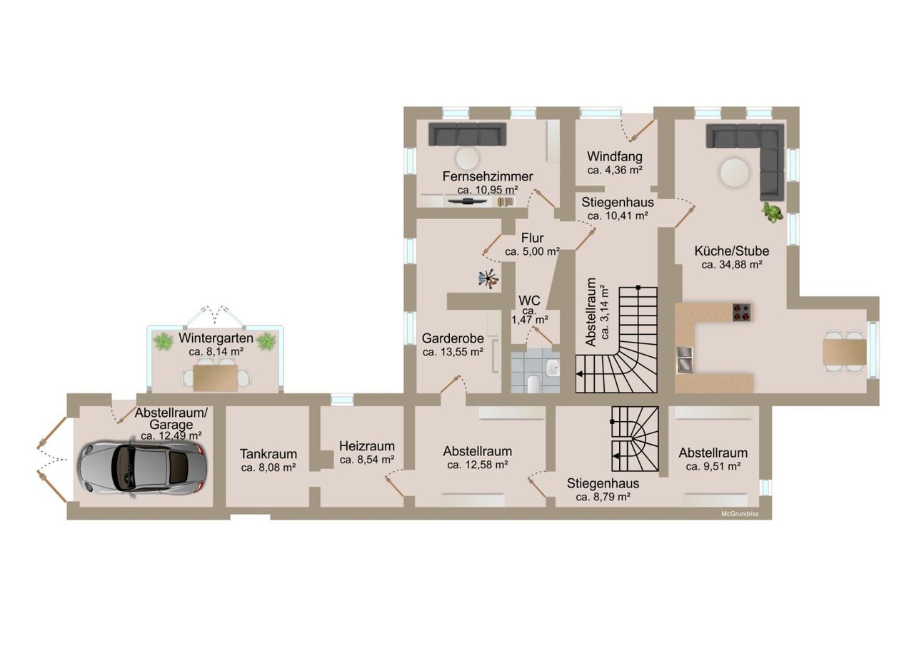 - Erdgeschoß mit Eingang, Stube mit Küche, Fernsehzimmer, Garderobe, Abstellraum und WC. Weiters Zugang zur Heizung und 2 Stiegenaufgänge ins Obergeschoß