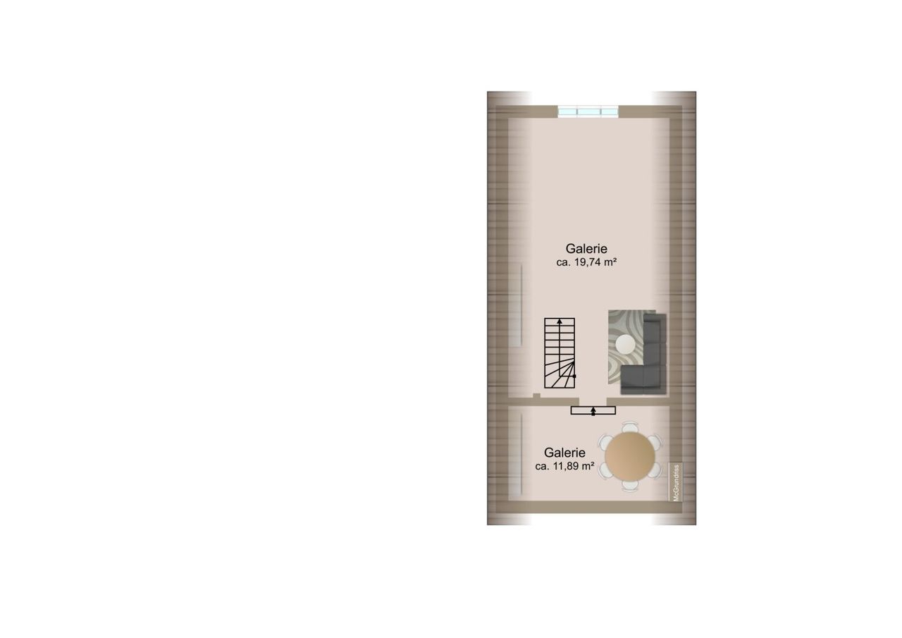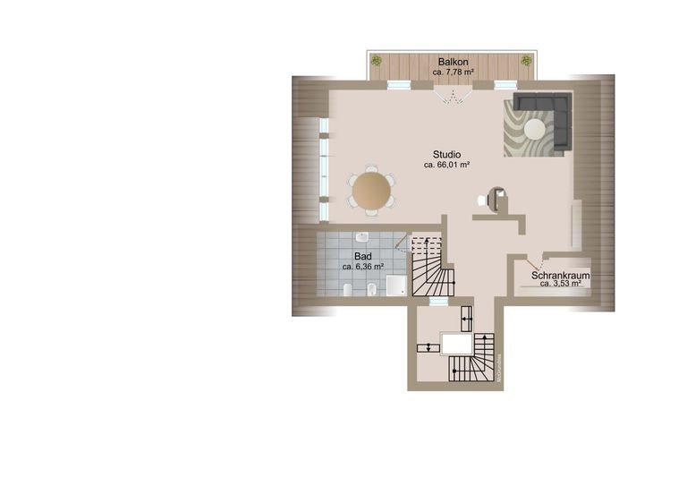 - Dachgeschoß: Studio mit 66 m2 und Balkon, Schrankraum, Bad, Stiegenaufgang