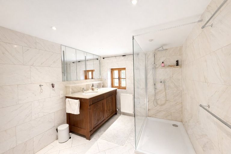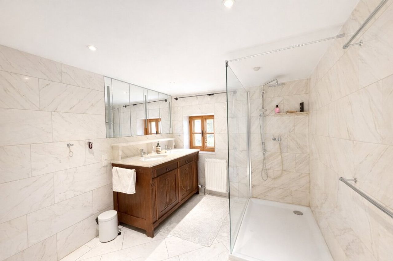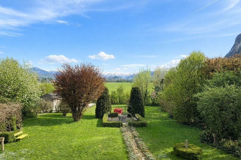 Was ist schöner, als direkt vom Esstisch das ganze Jahr über in die großen gepflegten Gartenanlagen zu schauen? Das Haus selbst wurde im Laufe der Jahre immer wieder behutsam und geschmackvoll renoviert und auf den neuesten Stand gebracht: Hier trifft der Komfort der modernen Einbauküche auf den charmanten bäuerlichen Jogltisch. Dass auch hierbei nicht gespart wurde, zeigt auch die großzügige Pflasterung mit Adneter Marmor aus dem nahen gelegenen Steinbruch im Zugangsbereich des Hauses.