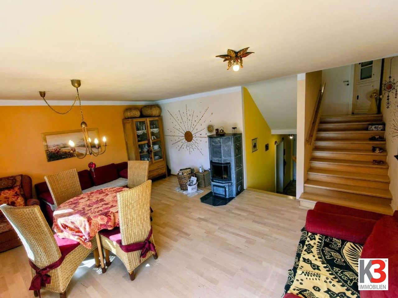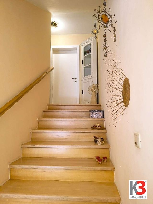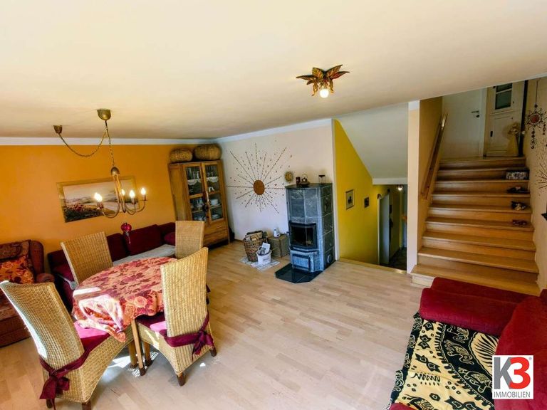Großzügiges, lichtdurchflutetes Wohnzimmer mit Kachelofen und mit Zugang zum Balkon mit einer Südostausrichtung, separate Küche, Garderobe, Gäste-WC. Zentrales Stiegenhaus mit Zugang zu allen Ebenen.