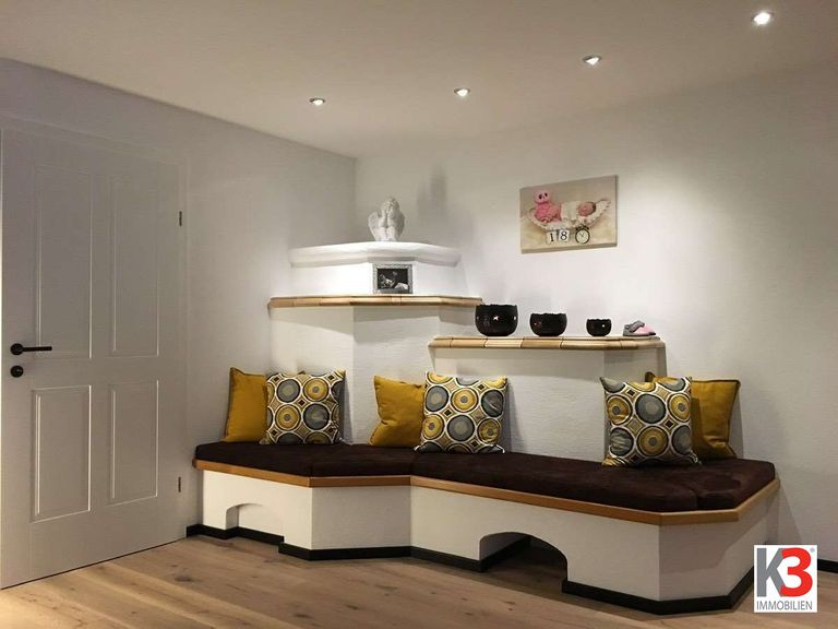 Erdgeschoss: Wohnzimmer mit Kachelofen, separate Küche mit Essbereich, Gästerzimmer, Badezimmer mit Badewanne und Fenster, Speis, separates WC, Garderobe.