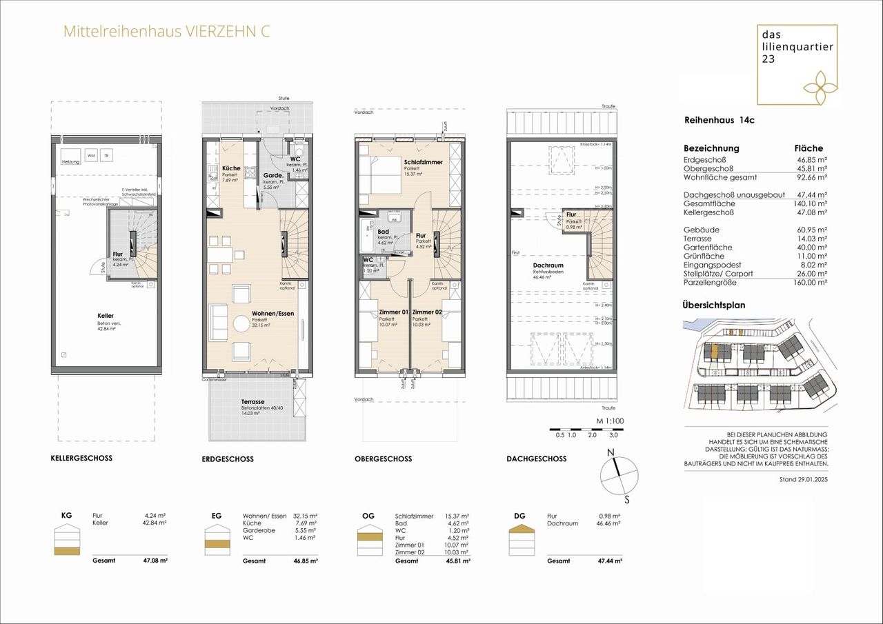 Das Mittelreihenhaus mit ca. 140 m² Wohnfläche, einem Garten mit Terrasse und Carport bietet alles was eine Familie zum Glück braucht: Großzügige Fensterflächen schaffen helle, lichtdurchflutete Wohnräume. Der Garten mit Terrasse erweitert das Wohnangebot und lädt zum Entspannen, Gärtnern, Feiern und Spielen ein. Das Dachgeschoss ist voll ausbaufähig und individuell gestaltbar – ideal für ein Elternschlafzimmer mit Bad, Büro, Hobbyraum oder Gästezimmer. Der große Keller bietet ausreichend Stauraum und Platz für Hobby, Sport und Wellness. Sonderwünsche sind je nach Bauphase möglich: z.B. ein größeres Badezimmer, Kachelofen oder ein ausgebautes Dachgeschoss. Eine Photovoltaikanlage auf dem Dach senkt die Energiekosten und sorgt für energieeffizientes Wohnen in Kombination mit Fernwärme und der Fußbodenheizung. Für Ihre PKWs stehen ein Carport- und ein Außenstellplatz zur Verfügung, mit Vorbereitung für E-Mobilität (Leerverrohrung).