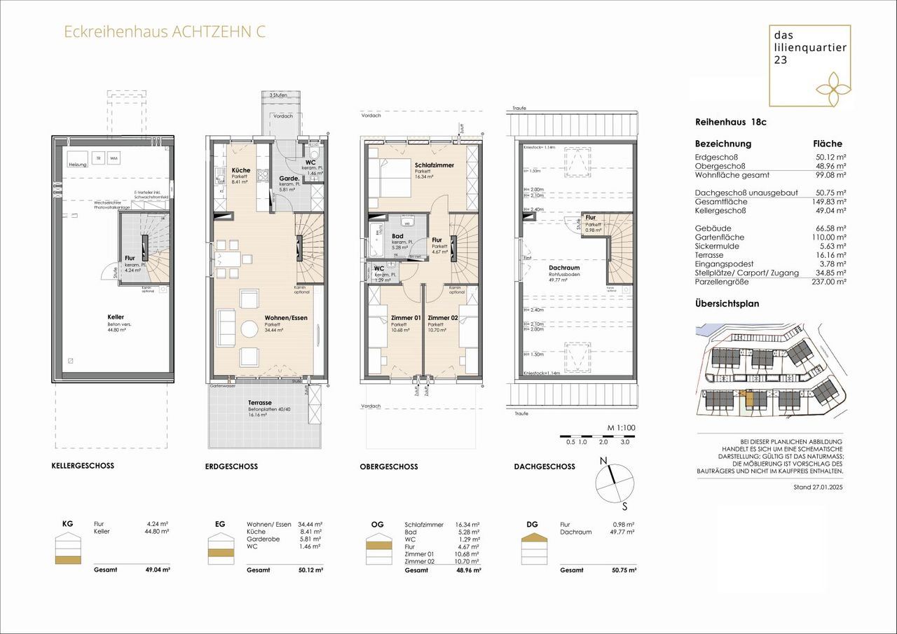 Das Mittelreihenhaus mit ca. 150 m² Wohnfläche, einem Südgarten mit Terrasse und Doppelcarport bietet alles was eine Familie zum Glück braucht: Großzügige Fensterflächen schaffen helle, lichtdurchflutete Wohnräume. Der Garten mit Terrasse erweitert das Wohnangebot und lädt zum Entspannen, Gärtnern, Feiern und Spielen ein. Das Dachgeschoss ist voll ausbaufähig und individuell gestaltbar – ideal für ein Elternschlafzimmer mit Bad, Büro, Hobbyraum oder Gästezimmer. Der große Keller bietet ausreichend Stauraum und Platz für Hobby, Sport und Wellness. Sonderwünsche sind je nach Bauphase möglich: z.B.: ein größeres Badezimmer, Kachelofen, ausgebautes Dachgeschoss. Eine Photovoltaikanlage auf dem Dach senkt die Energiekosten und sorgt für energieeffizientes Wohnen in Kombination mit Fernwärme und Fußbodenheizung. Für Ihre PKWs steht ein Doppelcarport im Eigentum, mit Vorbereitung für E-Mobilität (Leerverrohrung) zur Verfügung.